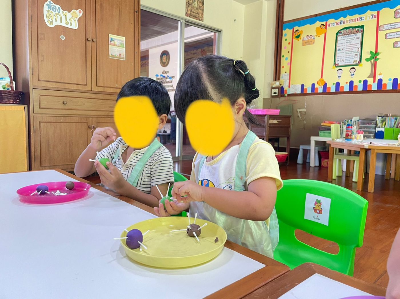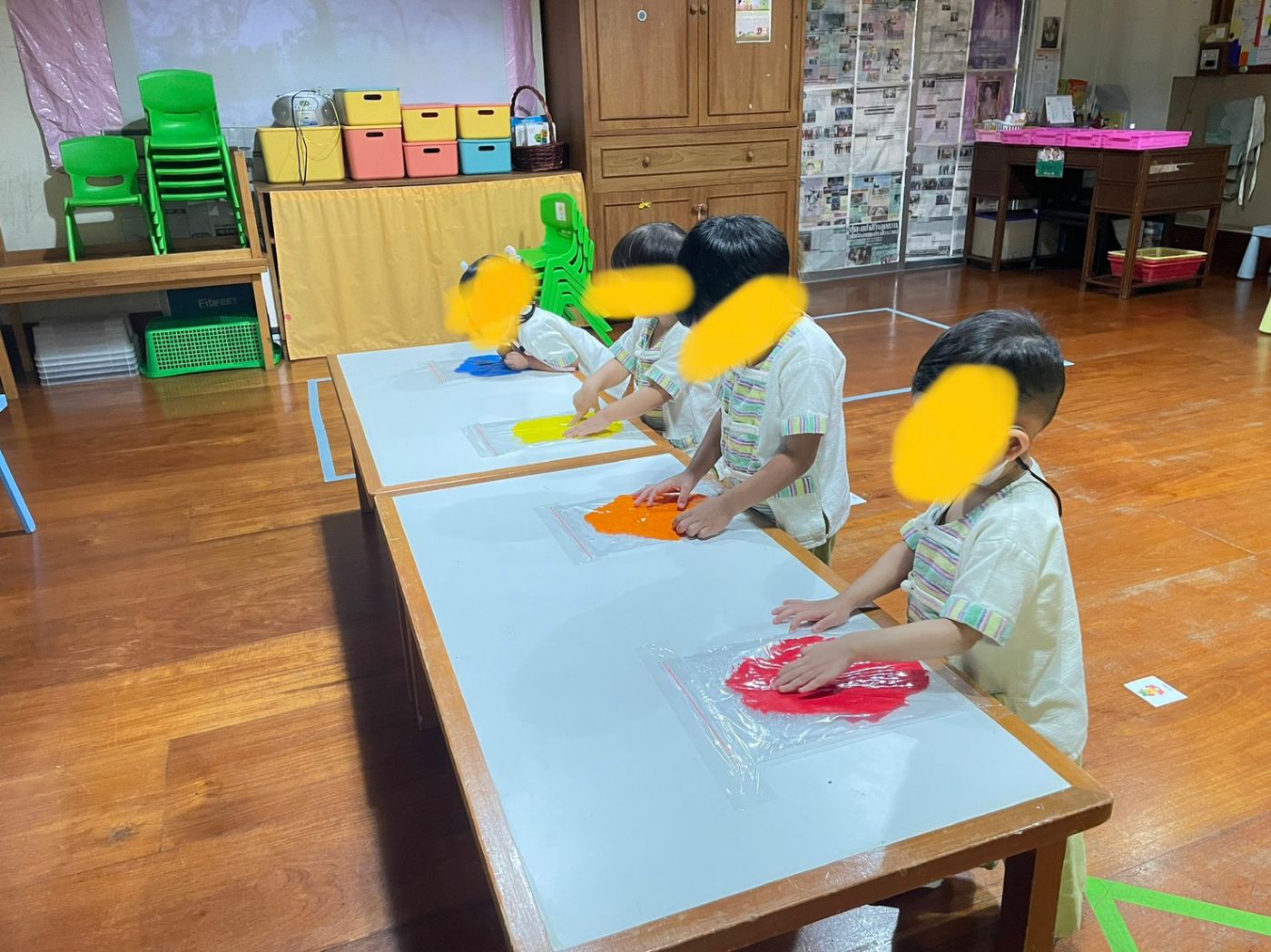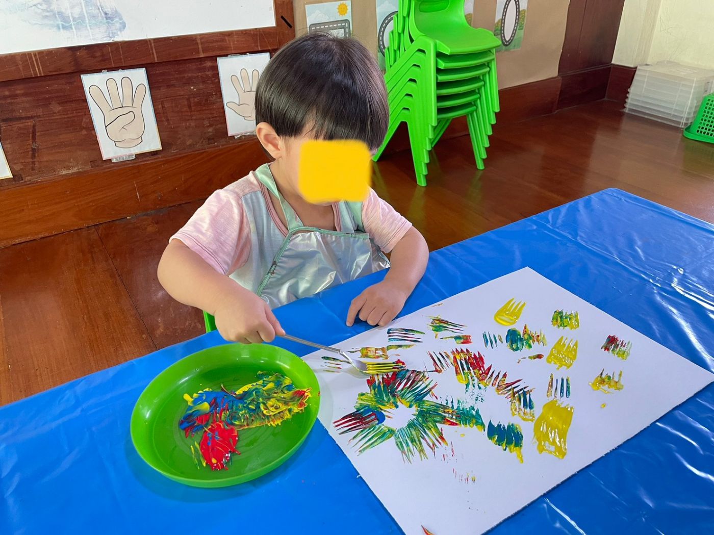 กิจกรรมหน้าเสาธงเต้นออกกำลังกายด้วยเพลง ล้างมือบ่อยๆ มีกิจกรรมกลางแจ้งให้เด็กๆเล่นลอดอุโมงค์ที่คุณครูทำไว้ให้หลบไปหยิบเอาลูกบอลที่มีภาพเชื้อโรคติดอยู่ เพื่อสมมติว่าเป็นตัวดักจับเชื้อโรค กิจกรรมในห้องสอนเสริมประสบการณ์ ก-ฮ A-Z 1-10 กิจกรรมพิมพ์ภาพจากส้อมกลายเป็นรูปดอกไม้ตามจินตนการของเด็กๆ