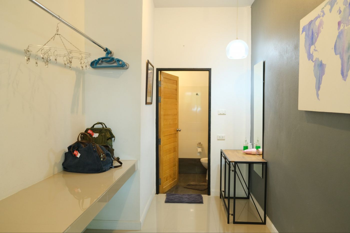เดินถัดมาอีกนิดจะเจอที่วางของกับโซนแต่งตัว กว้างมากกกกก มากับเพื่อนไม่ต้องกลัวว่าจะไม่มีที่กระจายของนะคะ เราตากผ้าพาดเอาไว้ยังเหลือที่เลยอะ