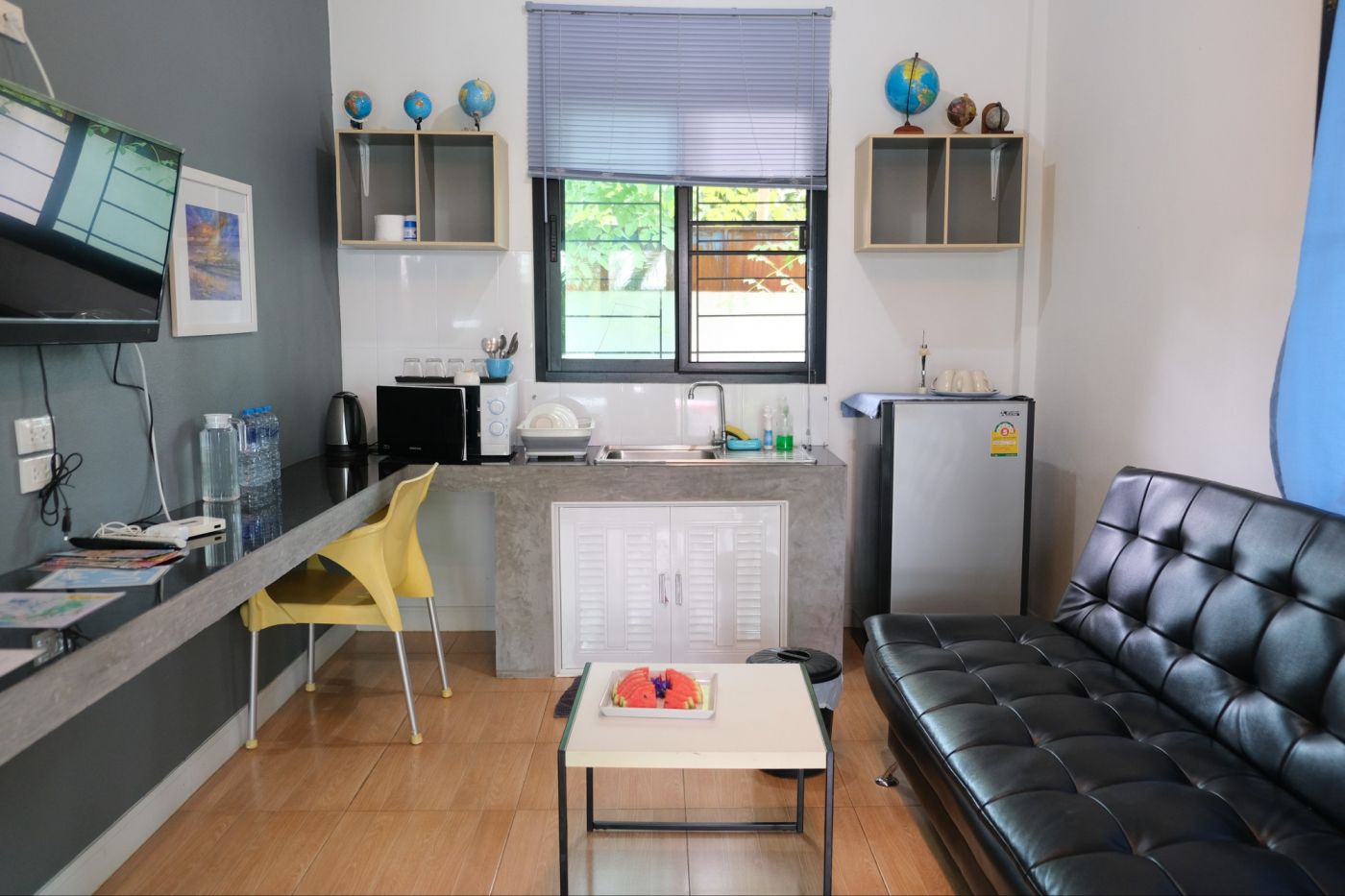 พอเดินเข้ามาจะเจอห้องนั่งเล่นก่อนเลย มีทีวี ตู้เย็น อุปกรณ์จานชามต่าง ๆ ครบ ซื้ออาหารจากข้างนอกเข้ามากินตอนดึก ๆ ได้เลย