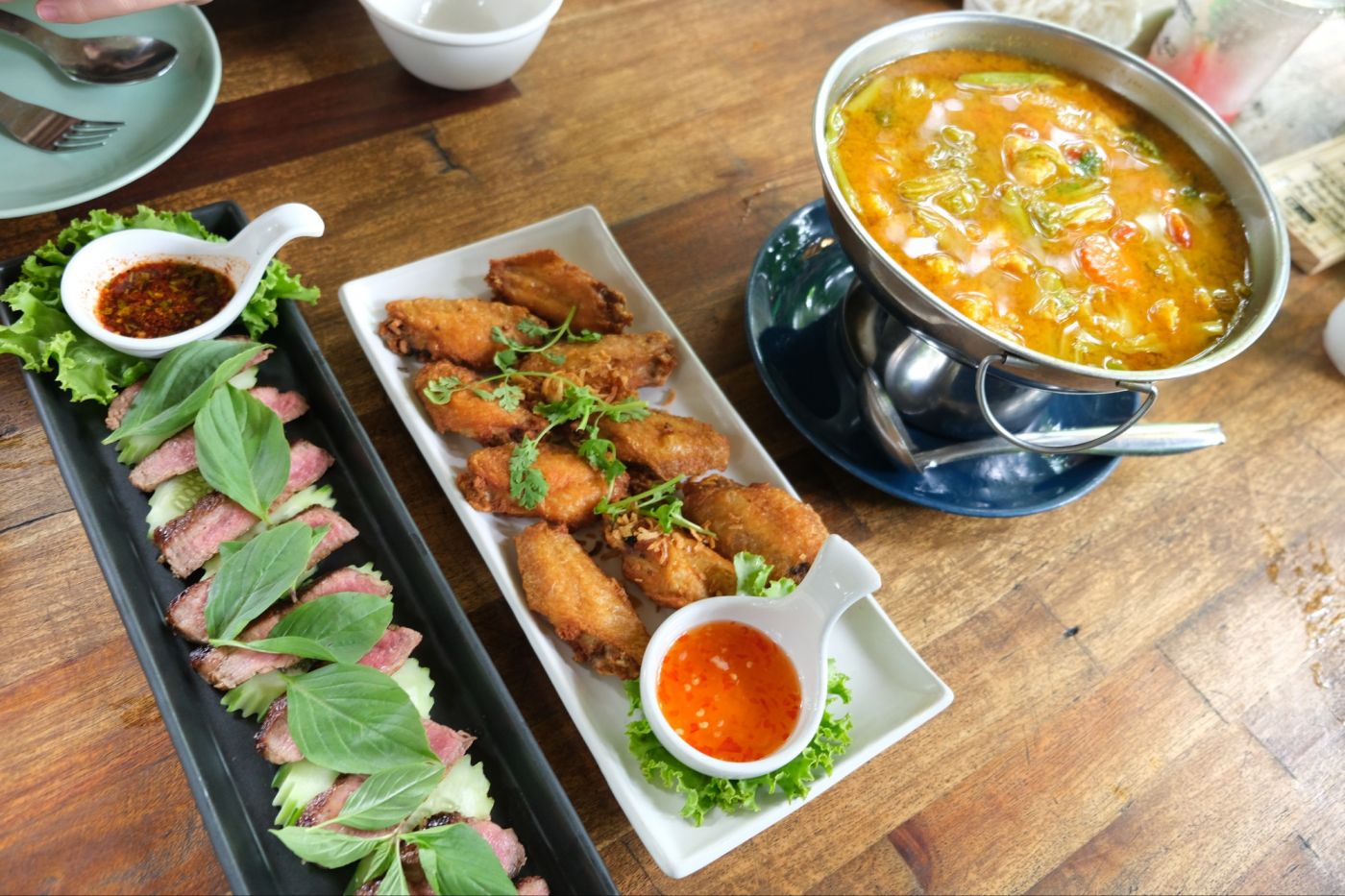 เมนูอาหารในร้านส่วนใหญ่จะเป็นอาหารทะเลย เนื้อ แล้วก็มีเมนูที่มีไก่นิดหน่อย ราคาอาหารอยู่ที่ประมาณ 100 - 400 เราสั่งแกงส้ม ปีกไก่ทอด แล้วก็เนื้อย่างจิ้มแจ่ว แล้วก็ข้าวสวยกันคนละถ้วย ที่นี่มีทั้งของคาวและของหวาน เมนูน้ำก็มีให้เลือกเยอะมาก เราสั่งน้ำมะพร้าวปั่น แตงโมปั่น แล้วก็อัญชัญโยเกิร์ตมาลองชิม อาหารอร่อยทุกเมนู แล้วก็ได้เยอะมาก ๆ ตอนสั่งระวังอย่าเพิ่งหน้ามืดสั่งเยอะนะคะ เราเกือบลุกไม่ขึ้น อิ่มมากกกกก