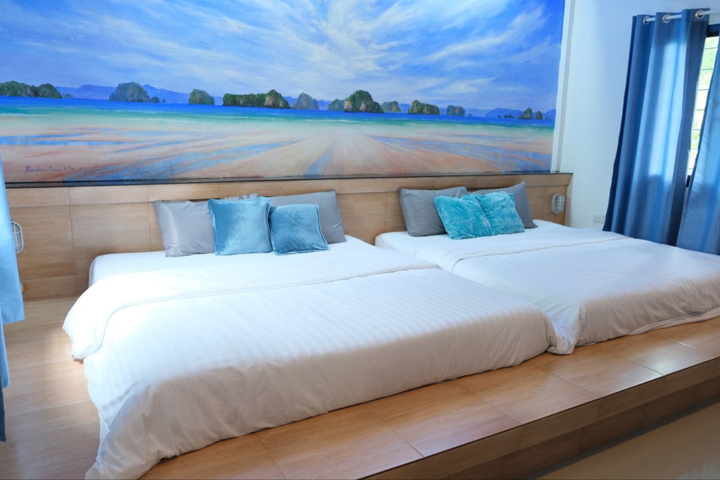 ห้องนอนเราภูมิใจนำเสนอมาก เพราะว่ากว้างมากกกก ตอนแรกเราจะไม่ได้ห้องนี้นะ แต่จะได้ห้องที่อยู่บนตึกด้านหน้าแทน แต่เพราะว่าเรามีรถมาด้วย แถมช่วงที่เราไปพักยังไม่ค่อยมีคนไปเที่ยว เจ้าของที่พักเขาเลยอัปเกรดที่พักให้ไม่คิดราคาเพิ่มด้วย เตียง 6 ฟุต 2 เตียง อีกอย่างที่ชอบคือมีปลั๊กไฟตรงหัวเตียงด้วย ไม่ต้องลากสายยาว ๆ ตอนเราไปพักได้ราคาห้องละ 850 บาท / 2 คน แต่เราไปกัน 3 คนก็บวกเพิ่มคนละ 200 ต่อคืน คุ้มไม่ไหว