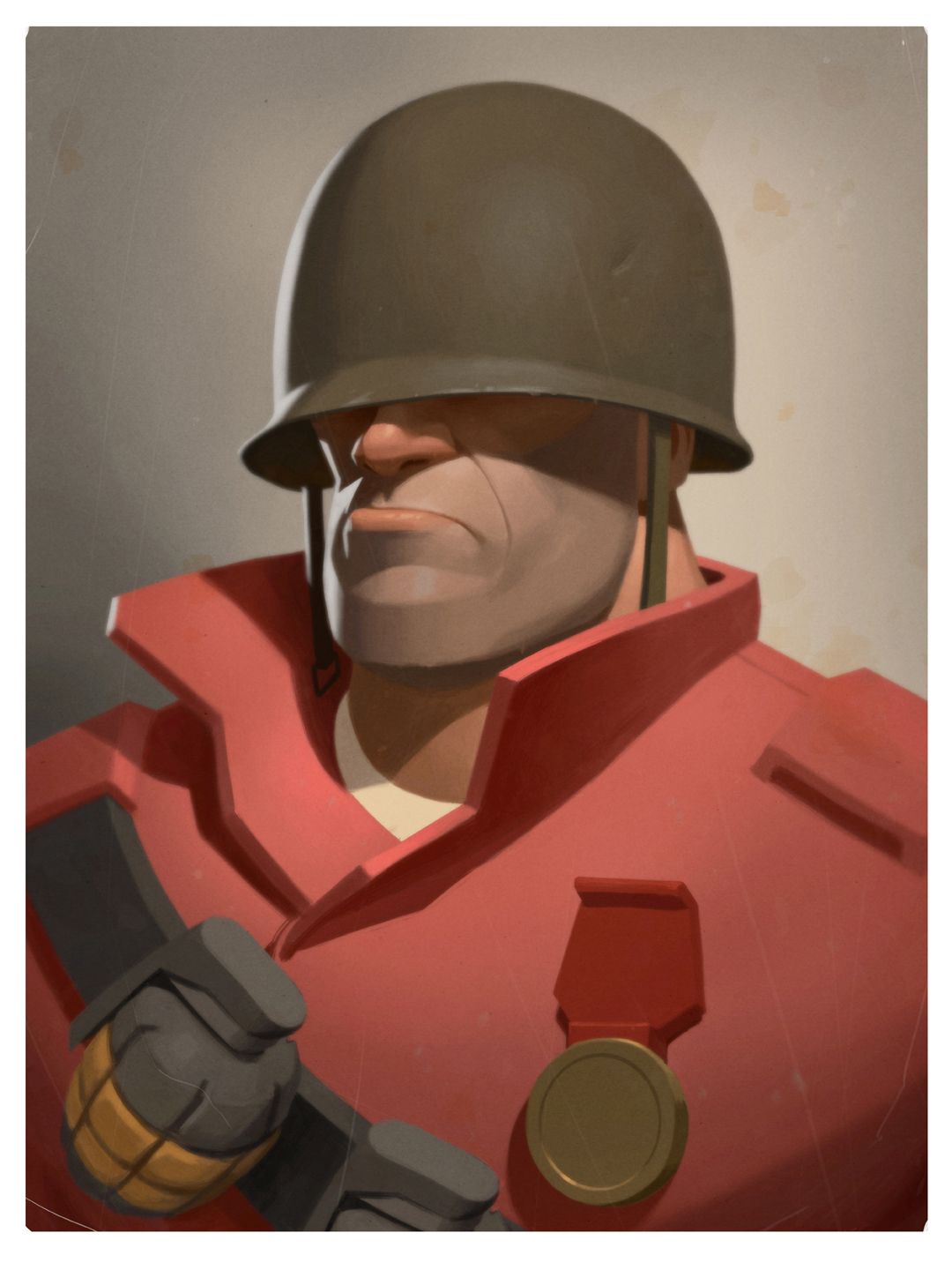 คลาสที่สอง Soldier เป็น Your-Average-American-FPS-Character-Person-Guy-Man เอะอะๆ ก็ตะโกน USA! USA! โดดไปโดดมา ที่จริงแล้วโซลเจอร์ไม่เคยเป็นทหารจริงๆ หรอก แค่อยากเป็นเฉยๆ ก็เลยมโนว่าตัวเองเป็น แต่ด้วยความฉลาดที่เรียกได้ว่า below average (แค่กๆ) นางก็เลยยังไม่รู้ตัวว่าตัวเองกำลังมโนอยู่