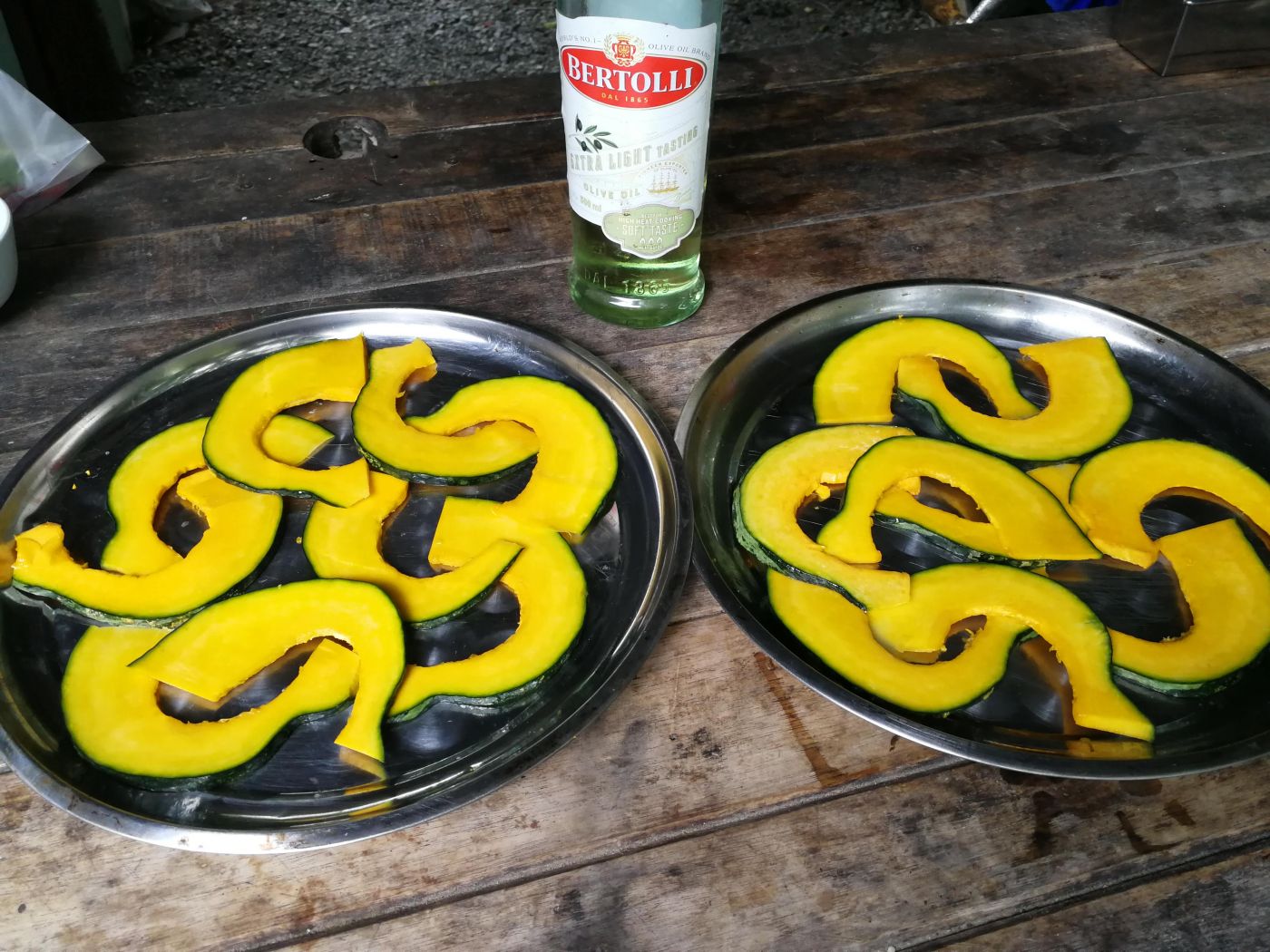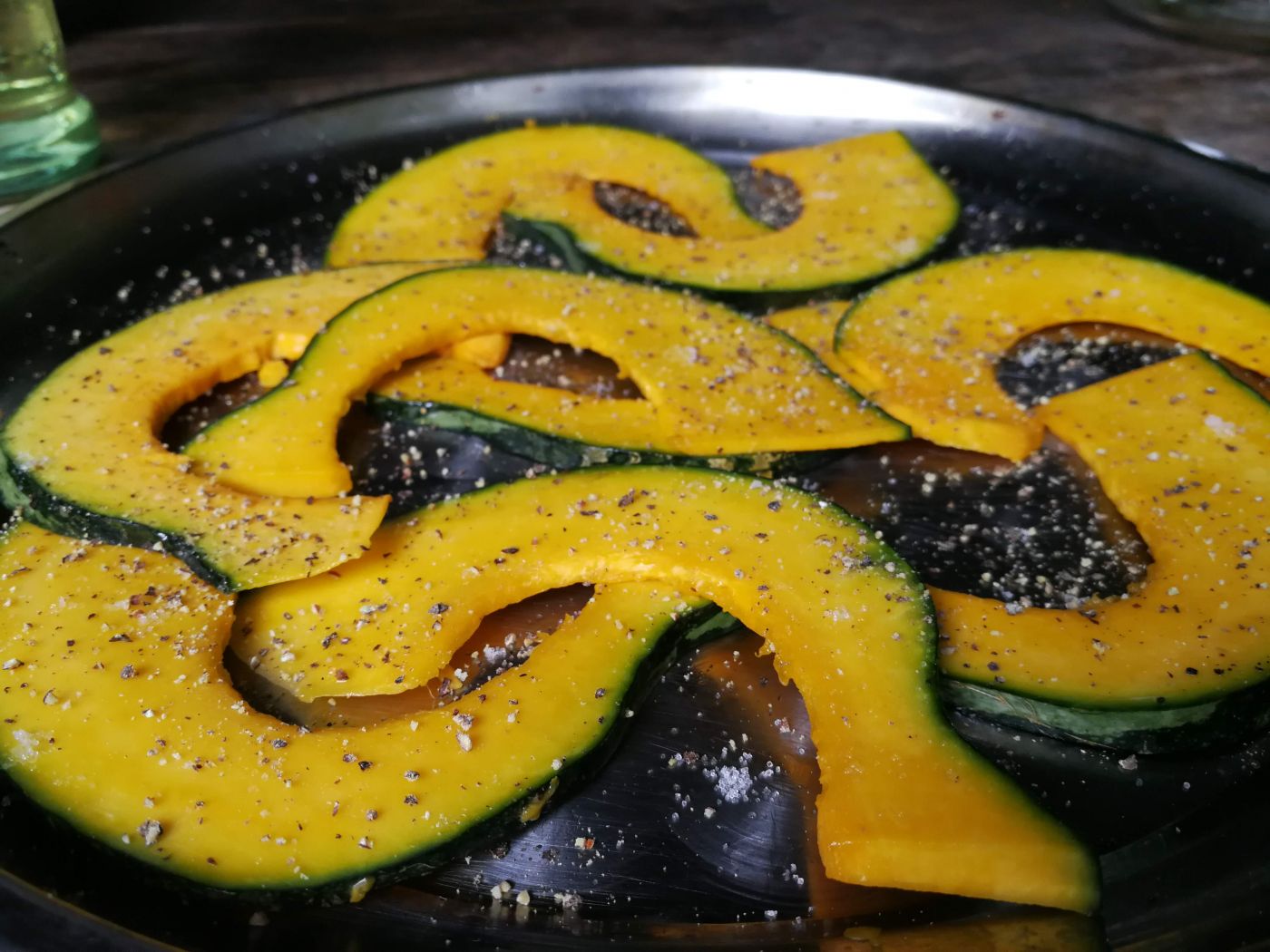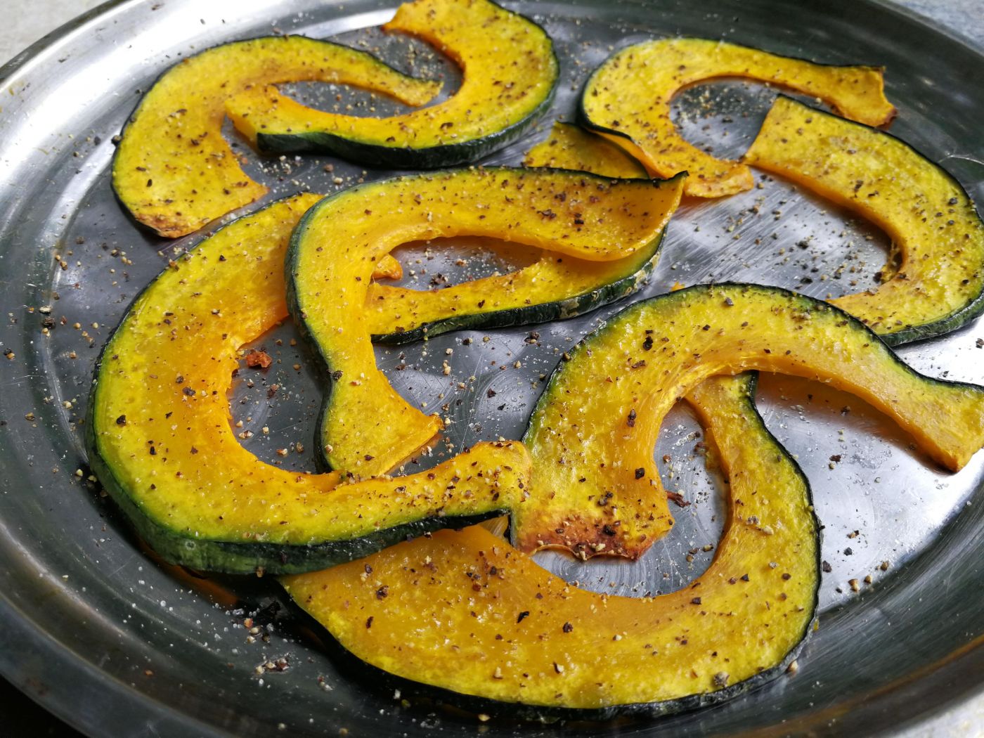 มาเรามาเริ่มที่ขั้นตอนแรกกันเลยดีกว่า  ฟักทองที่เราใช้จะเป็นฟักทองญี่ปุ่น เพราะเนื้อฟักทองจะเเน่นและมันกว่าฟักทองไทย  เลือกฟักทองที่ใกล้แก่แล้วจะมันอร่อย  นำมาล้างขัดเปลือกฟักทองให้สะอาด  เราจะไม่ปลอกเปลือกทิ้งแต่จะกินทั้งเปลือกได้เลย  ล้างเสร็จฝานฟักทองออกเป็นแผ่น ๆ หนาประมาน 3 มิลลิเมตร เรียงใส่ถาดทาด้วยน้ำมันมะกอกเล็กน้อย