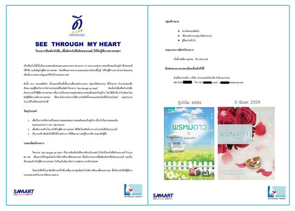 สวัสดีค่า ขอพูดถึงเรื่องนี้หน่อยนะคะบางคนอาจยังไม่เคยทราบว่าเรื่องพรหมดาว เป็น ๑ ในหลายเรื่อง (ในเครืออมรินทร์ ๒๙เรื่อง)ที่กลุ่มสามารถเลือกไปจัดทำเป็นหนังสืออักษรเบรลล์เพื่อถวายเป็นพระราชกุศลแด่พระบาทสมเด็จพระเจ้าอยู่หัวฯรัชกาลที่ ๙ เนื่องในปีมหามงคลฉลองพระชนมพรรษาครบ ๗ รอบ เมื่อปี ๒๕๕๔ ค่ะ (ตาม proposal ด้านล่างนะคะ)เป็นเรื่องที่นึกกี่ครั้งก็รู้สึกเป็นเกียรติมากจริงๆ ค่ะ