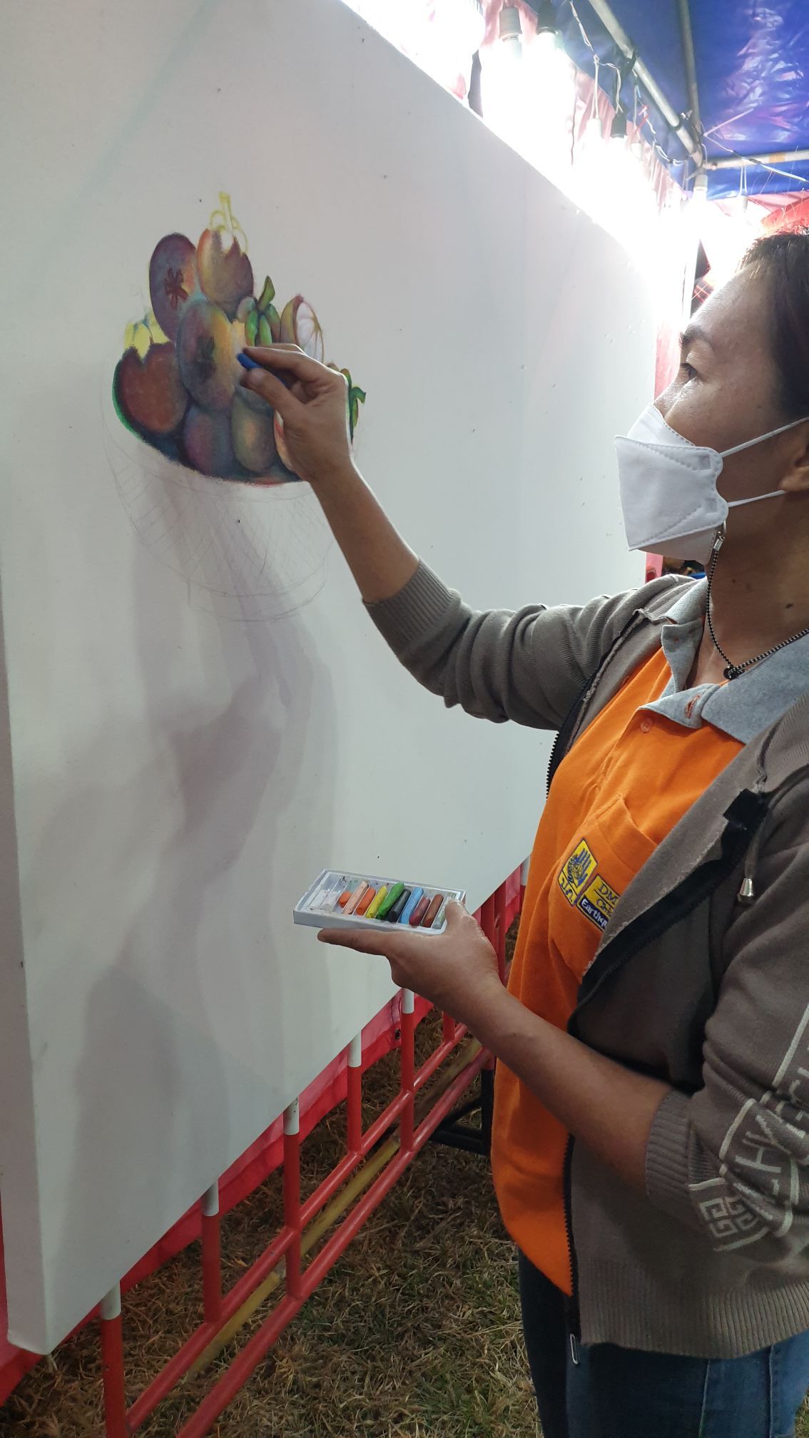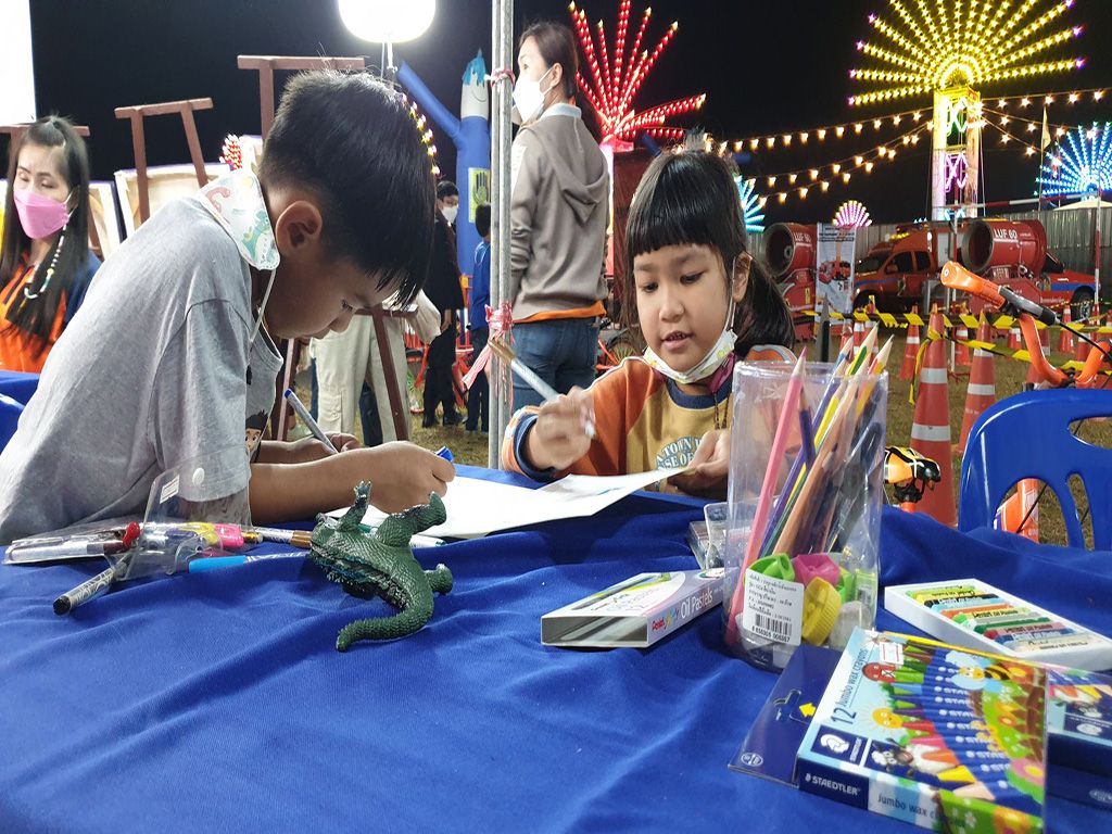 ในช่วงกลางคืนเรากับพ่อมาเฝ้าบูธโดยเจ้าหน้าที่เเต่ละคนต้องเฝ้าบูธหนึ่งวันจัดตามความสะดวกของเเต่ละคนไป ซึ่งในบูธจะมีโซนชวนให้เด็กๆ มาวาดรูป ซึ่งคนออกไอเดียนี้คือพี่เจ้าหน้าที่คนหนึ่งที่เป็นศิลปินของเชียงรายอยู่เเล้ว เราเองก็ได้มาทำหน้าที่นี้คอยช่วยพี่เขาดูเด็กๆ ที่มาวาดรูป ด้วยความที่ว่าเป็นช่วงโควิดคนเลยน้อยทำให้ไม่มีคนเท่าไหร่ ทำให้ไม่ได้ทำหน้าที่อย่างเต็มที่มากนัก