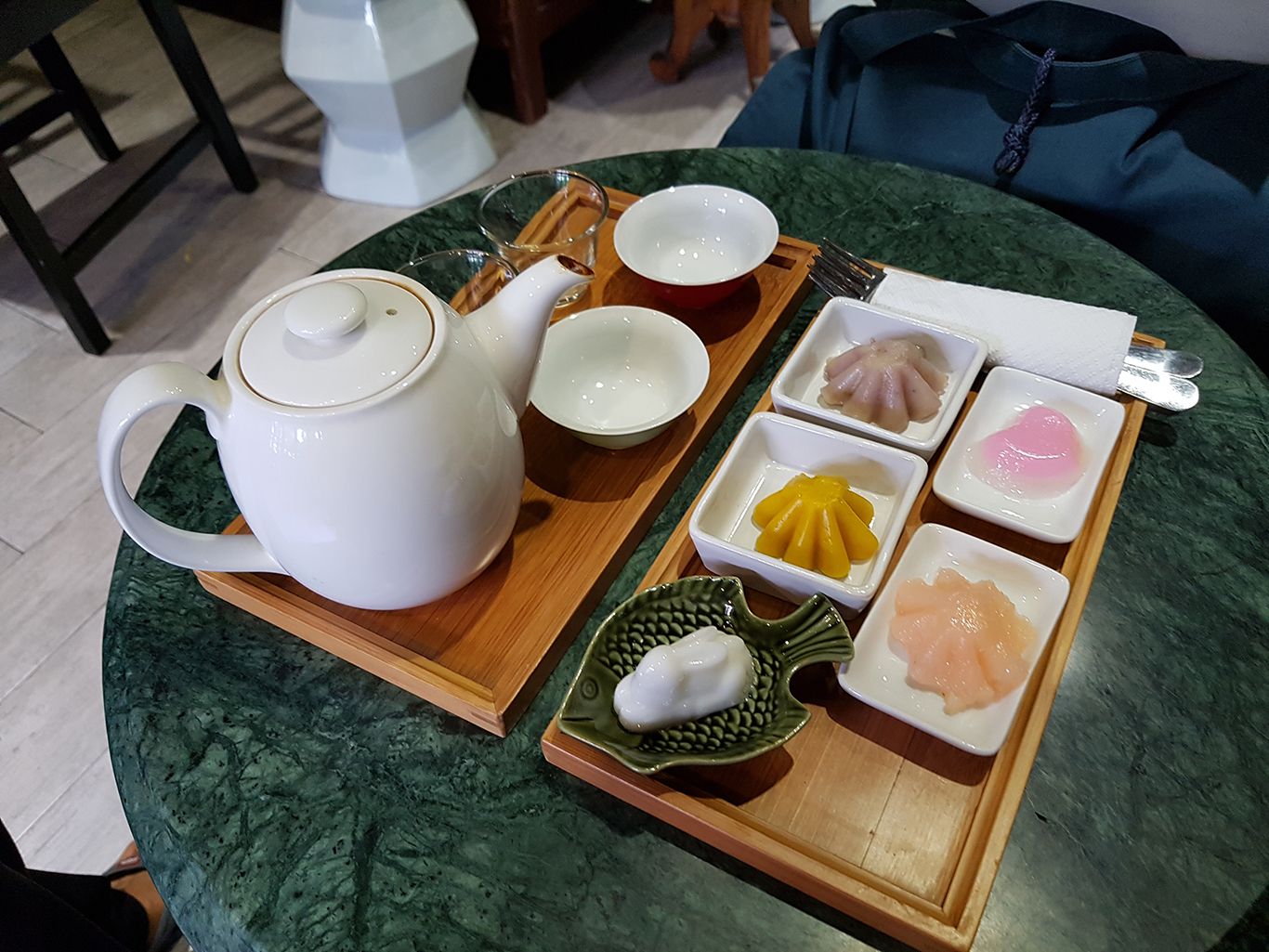 สำหรับเมนูก็จะเป็นชาจีนร้อน มีหลายประเภทมากค่ะ เริ่มต้นอยู่ที่ราคา 180 บาทต่อชุด จะเป็นน้ำชา 1 กา เสิร์ฟพร้อมขนมหวาน 5 อย่าง โดยลูกค้า 1 ท่านต่อ1ชุดนะคะ แต่ถ้าไปกัน 3 คนจะสั่ง 2 ชุด พี่เค้าก็ไม่ได้ว่าอะไร