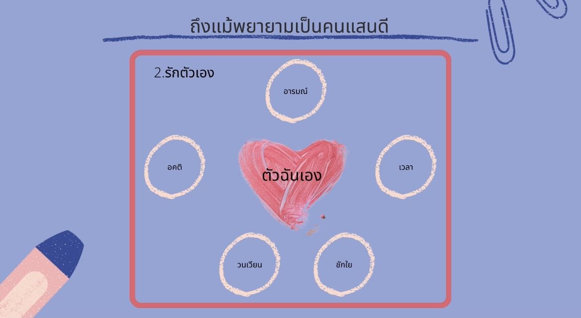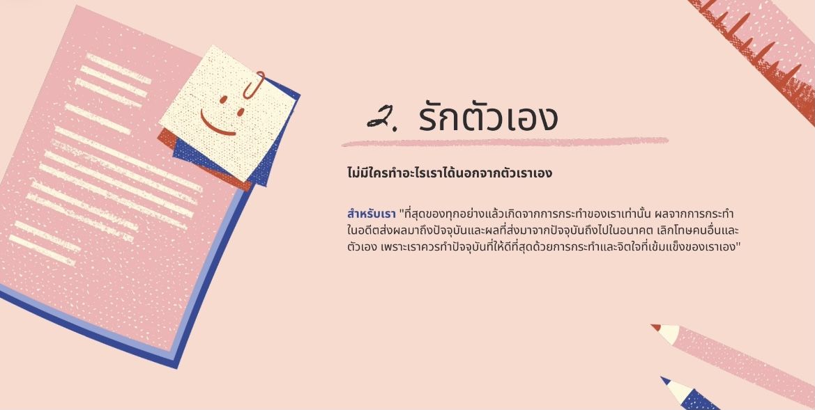 โดยที่รู้จักขอโทษเมื่อทำผิด ขอบคุณทุกคนที่ช่วยเหลือ ให้อภัยคนที่จะคิดแก้ตัวใหม่ รู้จักคนอื่นและรักคนอื่น แต่สิ่งสำคัญเหล่านั้นคือ ตัวเราเอง เราทำสิ่งเหล่านั้นที่ทำกับคนอื่นให้ตัวเราเองหรือยัง"