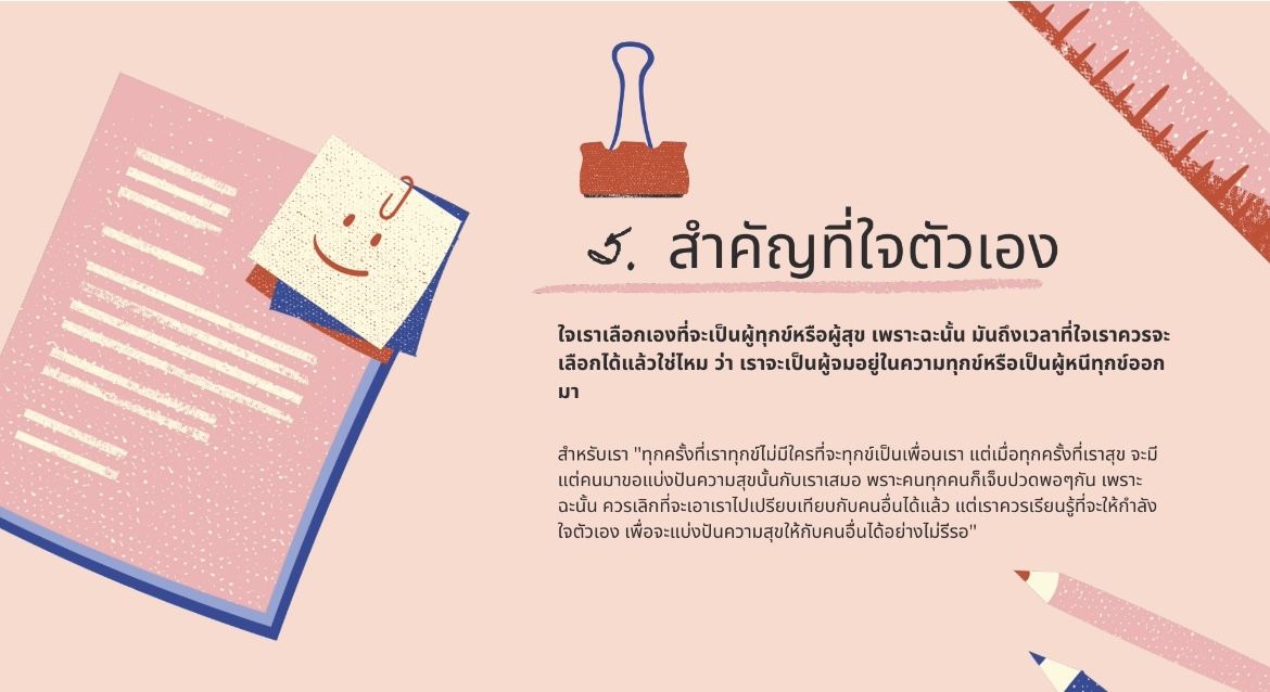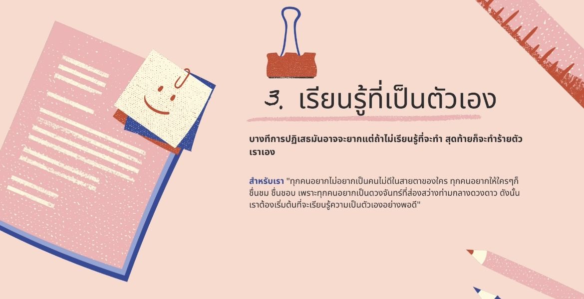 "เรียนรู้ที่เป็นตนเอง ว่า เราควรรู้จักยอมรับในตัวเราเอง และรู้จักปฏิเสธบางสิ่งบางอย่างที่เราทำไม่ได้
