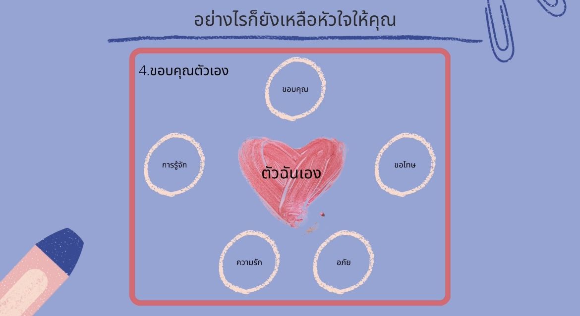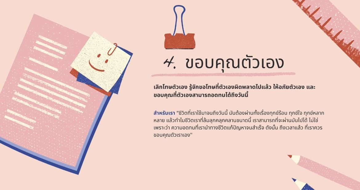 "ตัวอย่างนี้คือ เมื่อไหร่ที่เราเรียนรู้ขอบคุณตัวเอง รู้จักตนเอง ให้อภัยตนเอง ขอโทษตนเอง เราจะสามารถพาตนเองก้าวข้ามผ่านเรื่องเลวร้ายได้อย่างง่าย เพราะทุกอย่างผ่านไปแล้ว ไม่สามารถย้อนเวลากลับไปไม่ได้เเล้ว"