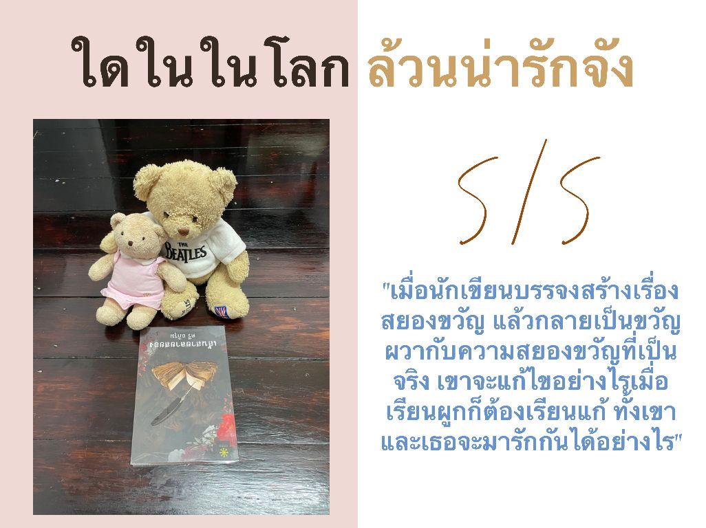 เรื่องราวในหนังสือเล่มนี้สนุกจนหยุดอ่านไม่ลงจริงๆ แต่ด้วยความสนุกปนสยอง ผมต้องพาน้องสาวหมีน่ารักสุดเรียบร้อยมาอ่านเป็นเพื่อน เพื่ออยู่ข้างๆผม เวลาผมอ่านแล้วกลัว แอบใช้มือน้องหมีบังตาผมสักข้างครับ