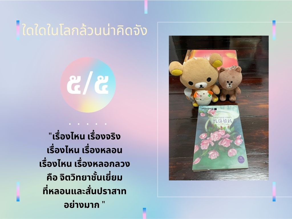 หนูขอเป็นคนเล่านะ พี่ริรัค หนูชอบเรื่องนี้มาก เพราะไม่มีผี ไม่มีอะไรสยอง ไม่มีฆาตกรรม (แต่ฆาตกรรมกายและใจด้วยความคิดตัวเอง ไม่เพียงเท่านั้น ฆาตกรก็คือแม่ ยาย ดร.เจตนา เข้าทรง นางชี และเจ้าแม่ หมอดูทุกสำนักที่เป็นฆาตกรเลือดเย็น ฆาตกรรมหริชาได้อย่างเลือดเย็นด้วยการสร้างความหลงผิดให้) แต่หนูกลับรู้สึกว่า ความคิดผู้หญิงคนนี้หลอนคนอ่านสุดๆ