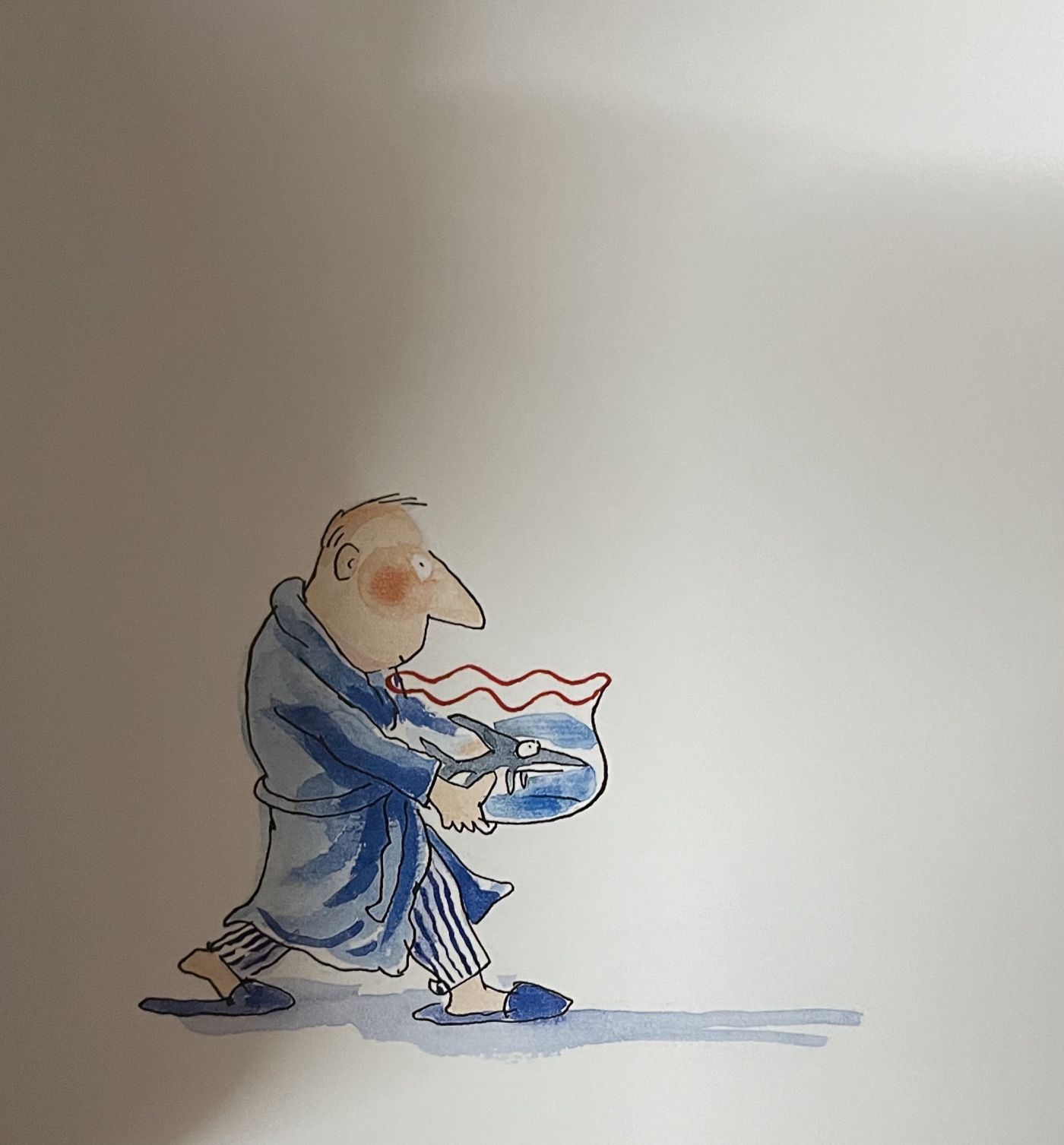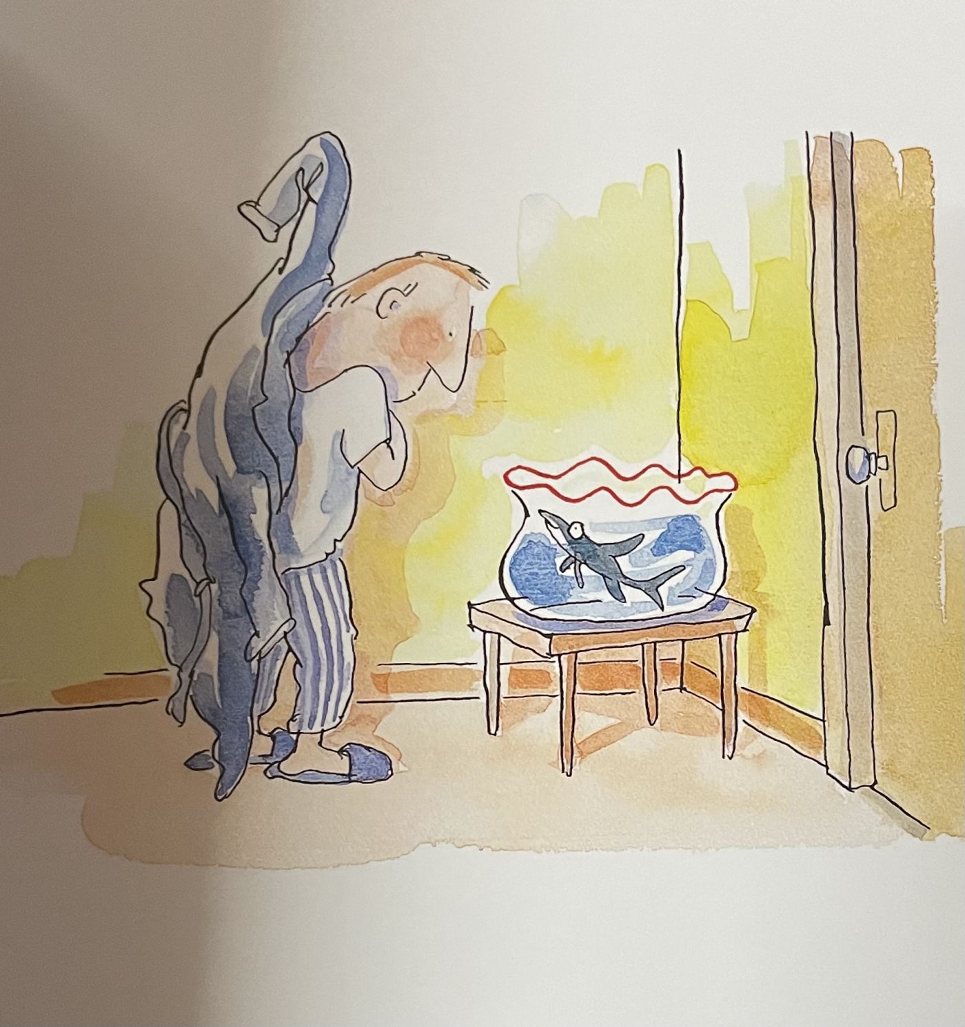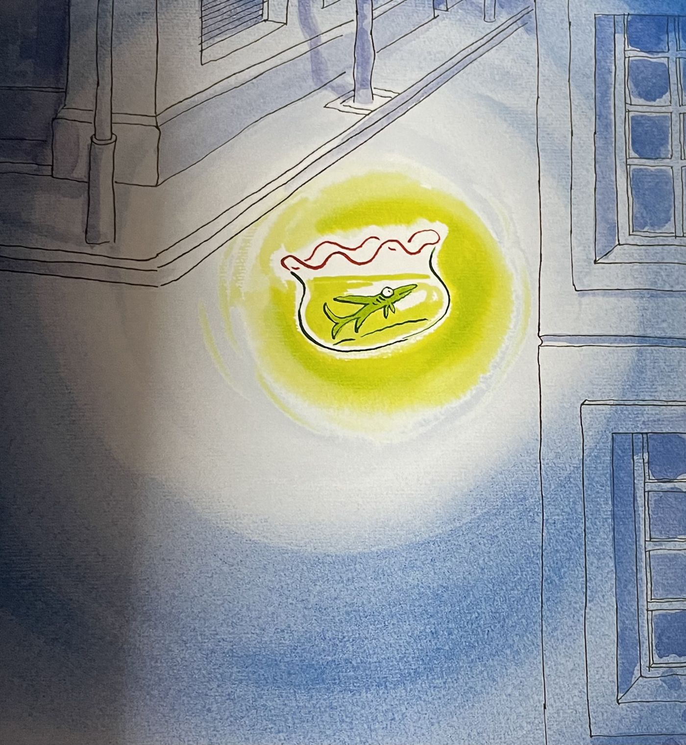 จนกระทั้งวันหนึ่ง ผู้ชายคนนั้นได้นอนหลับหลับฝันไป และพบว่า เจ้าปลายิ้มเรืองแสง พาเขาไปยังสถานที่มากมาย ไม่ว่าเต้นรำ พาไปในป่าลึก และได้ให้เขาแหวกว่ายอยู่ในทะเล ในขณะที่กำลังแหวกว่ายอยู่ ก็พบว่า ตัวเองกำลังว่ายอยู่ในโถปลา เลยตกใจตื่นขึ้นมา พบว่า เป็นเพียงแค่ความฝัน
