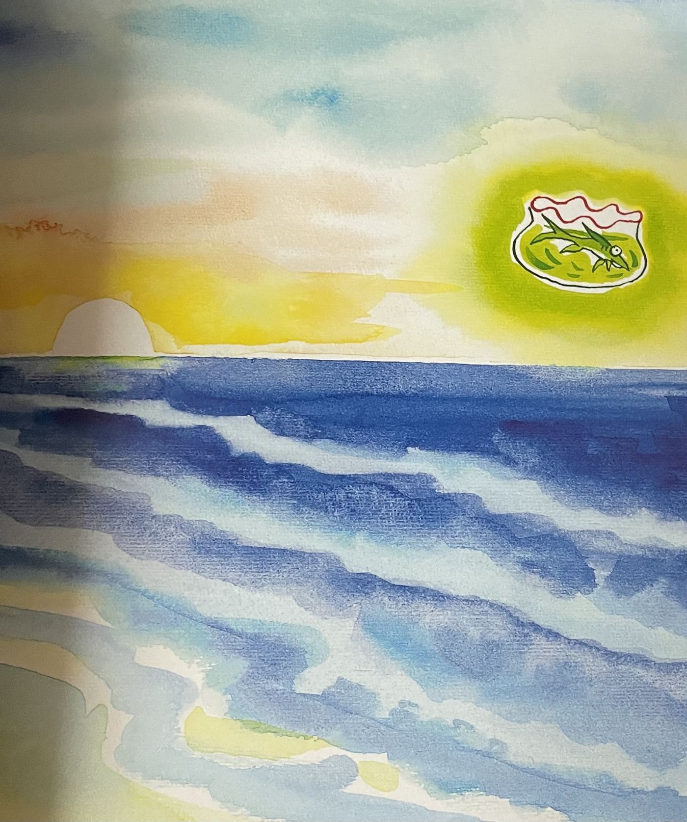 ผู้ชายคนนั้นเลยตัดสินใจนำปลาตัวนี้ไปปล่อยลงทะเล และในขณะที่ปล่อยอยู่นั้น ตัวของเขามีแสงสีเขียงเรืองแสงรอบๆตัว ลอยขึ้นไป ก่อนที่จะกลับบ้านไปพร้อมกับโถปลาที่ว่างเปล่า เปรียบเหมือนกับว่า พบกับอิสระแล้ว