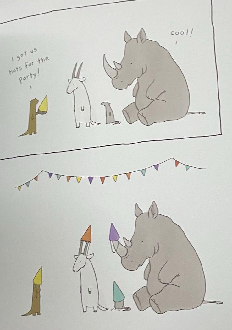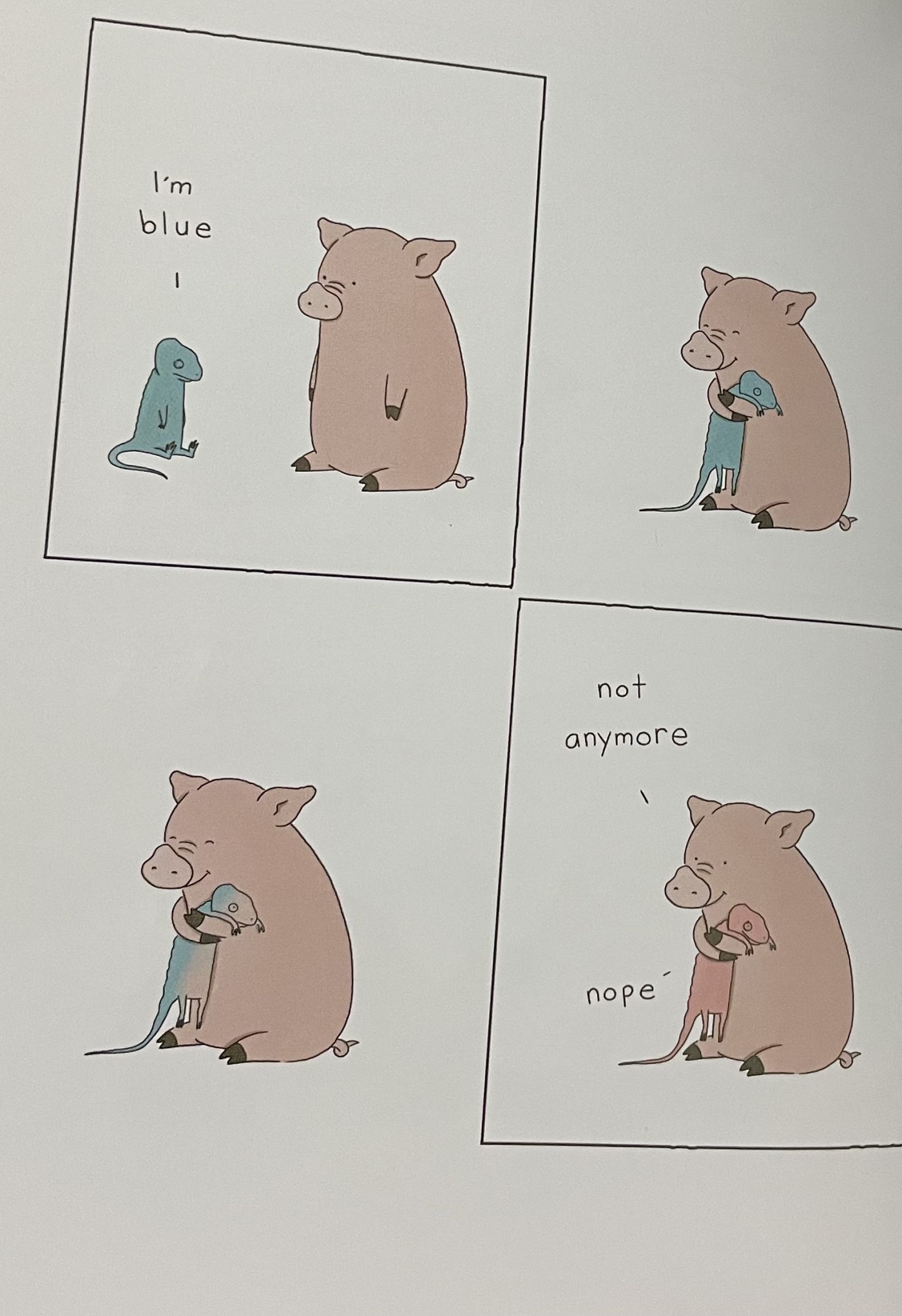 เจ้าหมูดึงเข้ามากอดจนเจ้ากิ่งก่าเปลี่ยนสีจากน้ำเงินเป็นสีชมพูแบบเดียวกับเจ้าหมูและเจ้าหมูกล่าวว่า