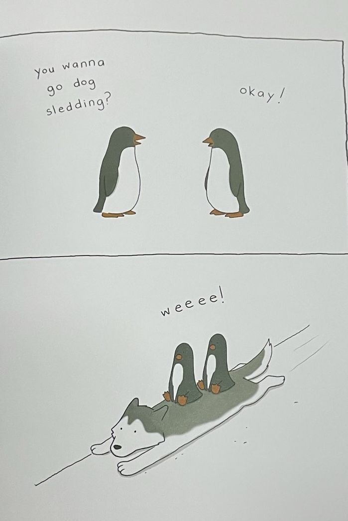 เจ้าเพนกวินทั้งสองคนก็ขึ้นหลังเจ้าหมาและเจ้าหมาพาตัวเอง สไลด์ลงมาท่ามกลางหิมะให้เจ้าเพื่อนได้เล่นสนุกกัน