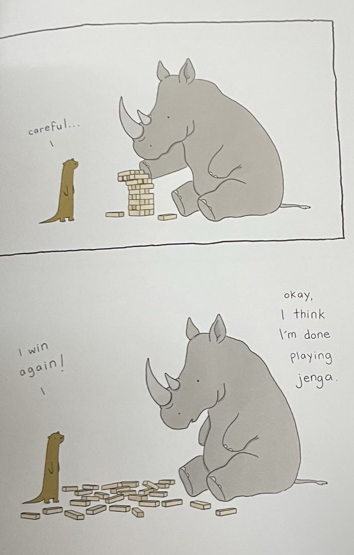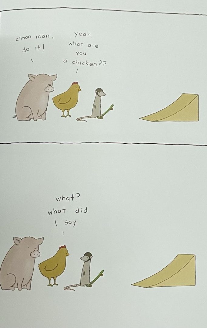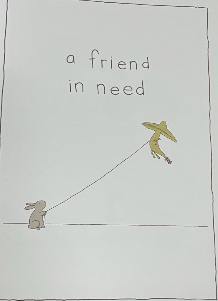 จากตัวอย่างนี้จะพบว่า เจ้าหมาเป็นเพื่อนที่ดีมาก โดยที่เจ้าเพนกวินทั้งสองอยากไปเที่ยว แต่บินไม่ได้ เจ้าหมาที่เป็นเพื่อนก็ยอมให้เจ้าเพนกวินขึ้นตัวและพาสไลด์ลงไป ซึ่งเจ้าหมาเป็นเพื่อนที่พึ่งพาได้จริงๆ