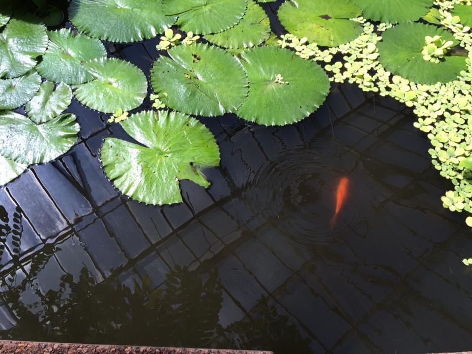 มีบ่อน้ำให้เราดูและพบว่า มีเจ้าปลาเหงาๆหลุดออกมาจากที่หลบภัย แต่ปลาหลายตัวยังอยู่ในสถานที่หลบภัย คือ ใบบัวในสระน้ำที่เป็นต้นเล็กๆให้คุณปลาสามารถพักพิงและพึ่งพิงกันอย่างดี