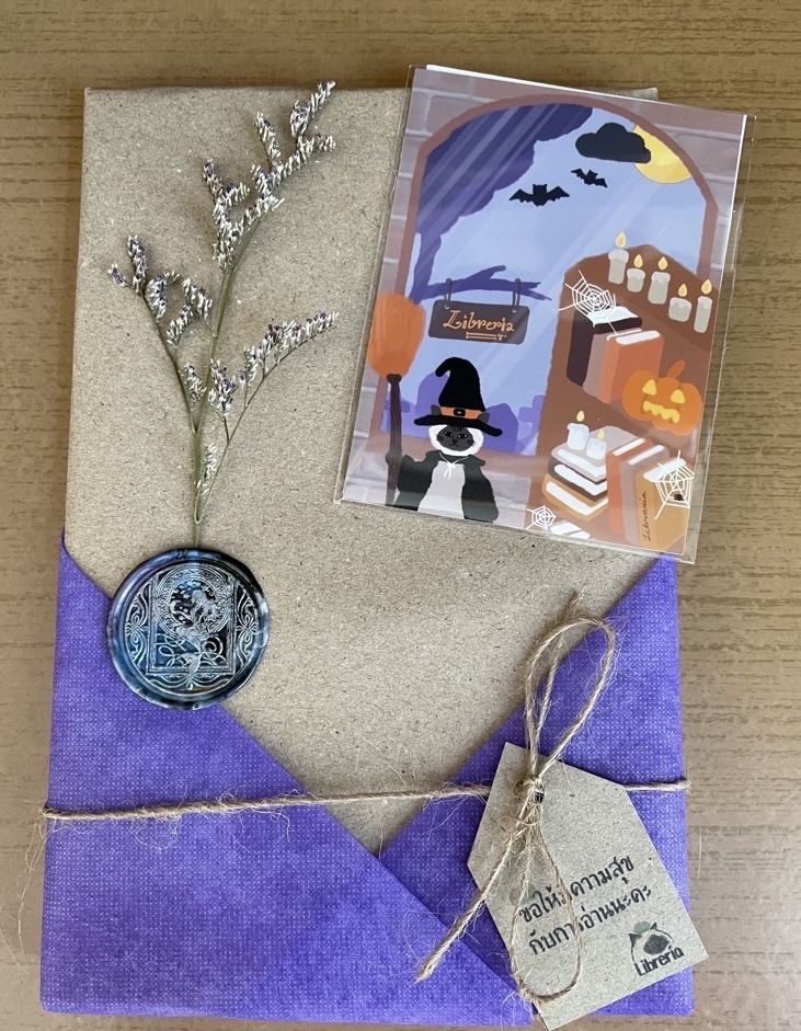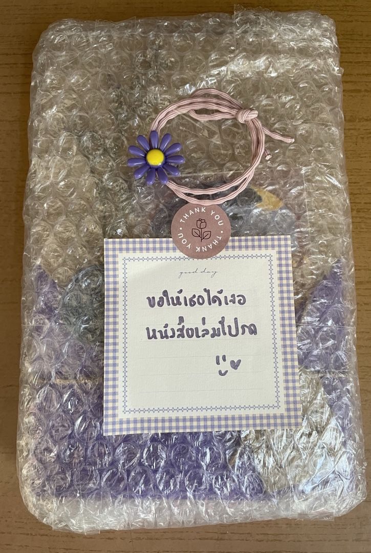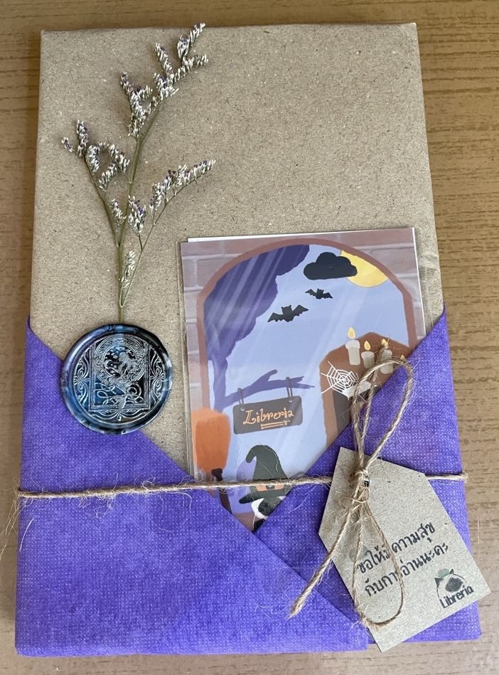 และพอเปิดออกไป ก็จะพบกับกระดาษห่อสีน้ำตาลแบบคลาสสิก พร้อมกับกระดาษสาสีม่วงและการ์ดอวยพร คือ ดูน่ารักมาก และมีข้อความสั้นๆ เขียนว่า "ขอให้มีความสุขกับการอ่านนะค่ะ"