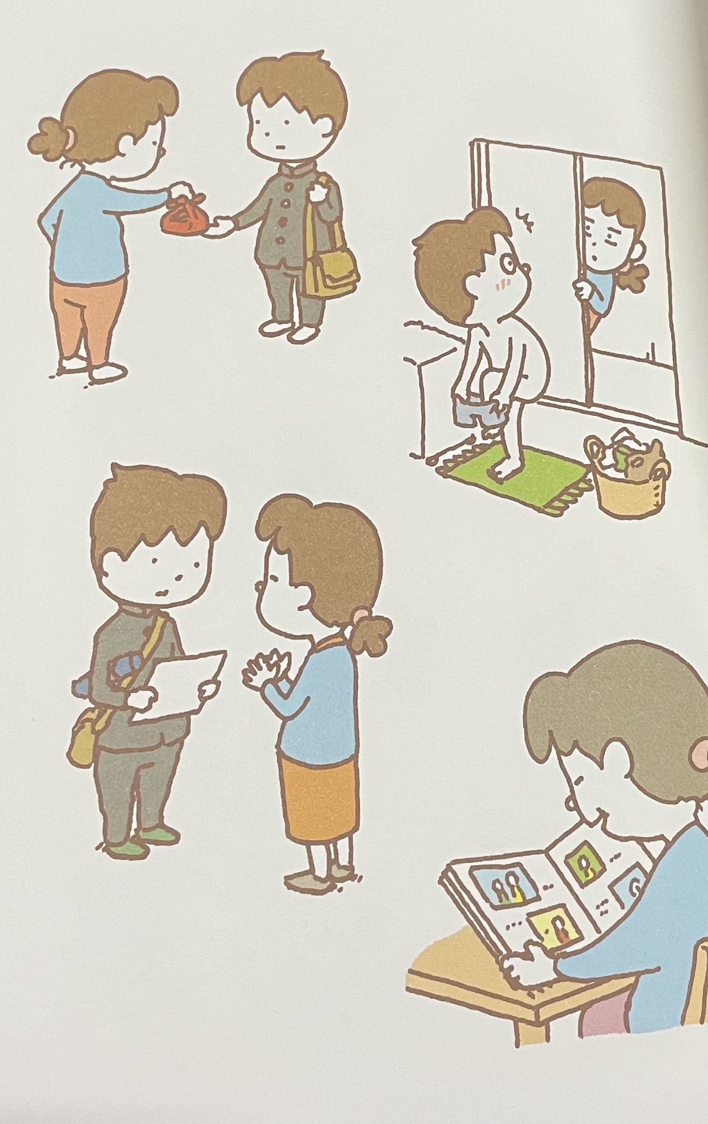เล่นกับเพื่อนเวลาเรียน | นั่งอยู่คนเดียวที่โต๊ะอ่านหนังสือ |