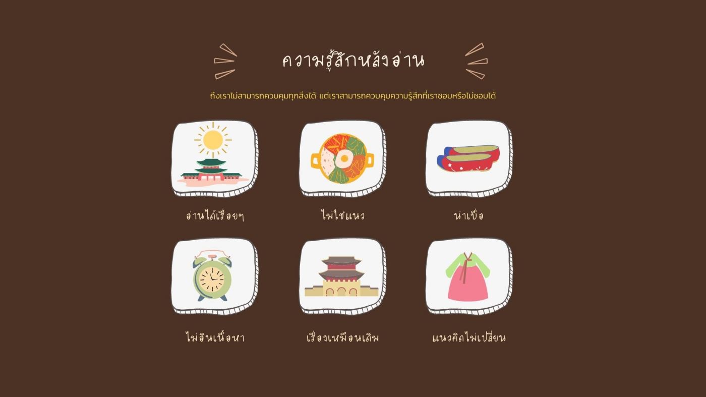เราคิดว่า เราคงชอบแนวเรื่องราวของหนังสือวรรณกรรมเยาวชนของฝั่งไทย ฝั่งไต้หวัน ฝั่งต่างประเทศและฝั่งญี่ปุ่นมากกว่า ถึงแม้เคยอ่านของเกาหลีหลายเล่มก็สนุก แต่ยกเว้นเล่มนี้ ที่ไม่สนุกและน่าเบื่อ เพราะสำหรับเราคือ หนังสือเล่มนี้อ่านตรึงได้แค่บทแรก แต่หลังจากนั้นก็รู้สึกเบื่อกับเนื้อหาแนวนี้ ที่พยายามยัดเข้ามา และเนื้อหาหลายอย่างก็ไม่อินเท่าไหร่ แถมหลายๆอย่างก็ดูไม่ค่อยเข้ากันเท่าไหร่ แต่เราคิดว่า ต้องอ่านให้จบ เพราะเพื่อนอุตส่าห์ซื้อมาให้