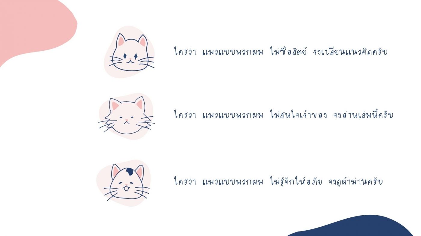 ครั้งแรก เราไม่อยากหยิบเล่มนี้มาอ่านเท่าไหร่ เพราะเราคิดว่า จะถูกหลอกเหมือนหลายๆเล่มที่ไม่ได้เป็นเรื่องราวเกี่ยวกับแมว แต่เป็นเรื่องราวที่นำแมวมาเป็นสัญลักษณ์อีก