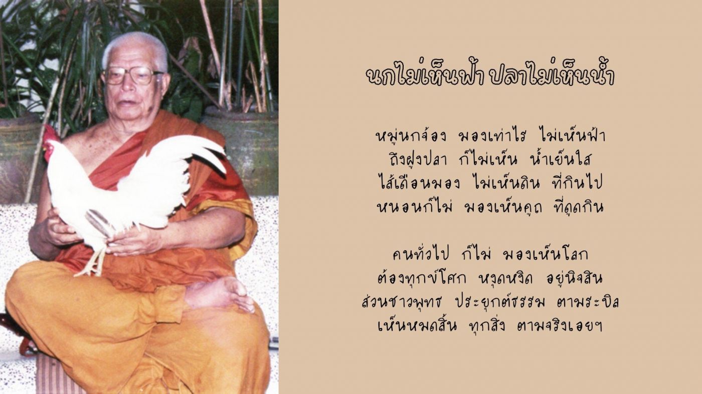 หลายครั้งในชีวิตของคนเราเปรียบเหมือน “นกไม่เห็นฟ้า ปลาไม่เห็นน้ำ” ดั่งกับคนที่ไม่เห็นโลกนี้ที่แท้จริงว่า จริงๆแล้ว โลกเราที่แท้จริงคืออะไร ถ้าเราเห็นตามโลกธรรมแล้ว และเข้าใจในโลกธรรมนั้นแล้ว เราพบความพอในใจ