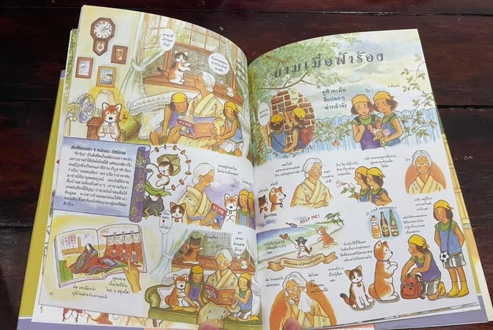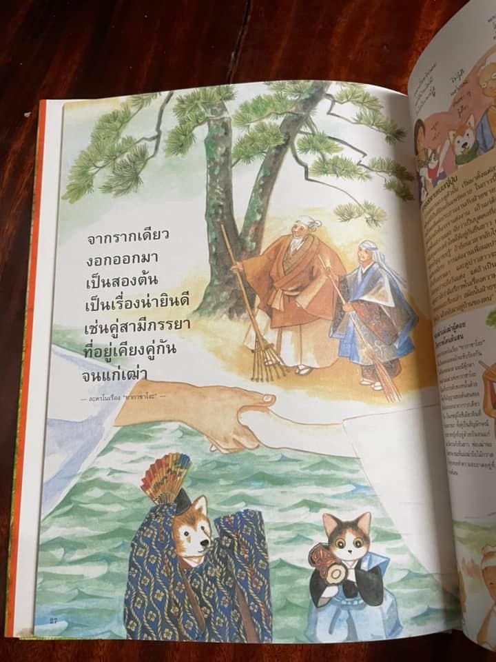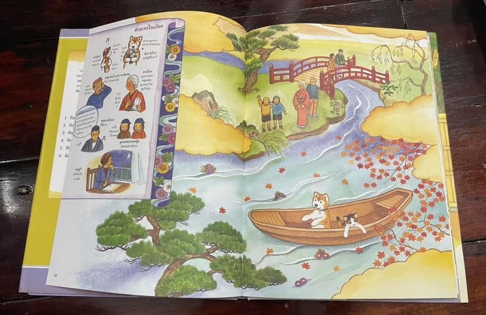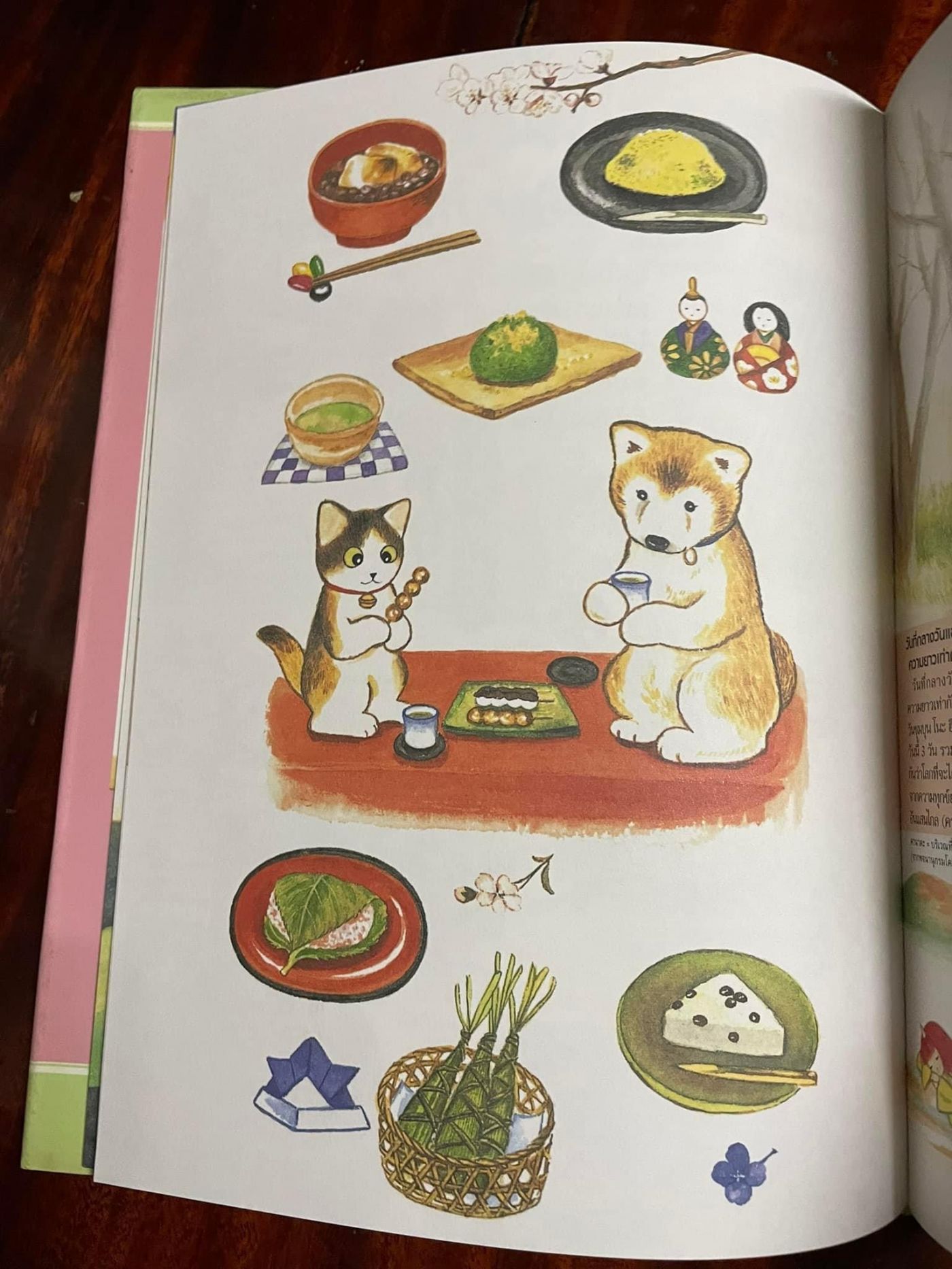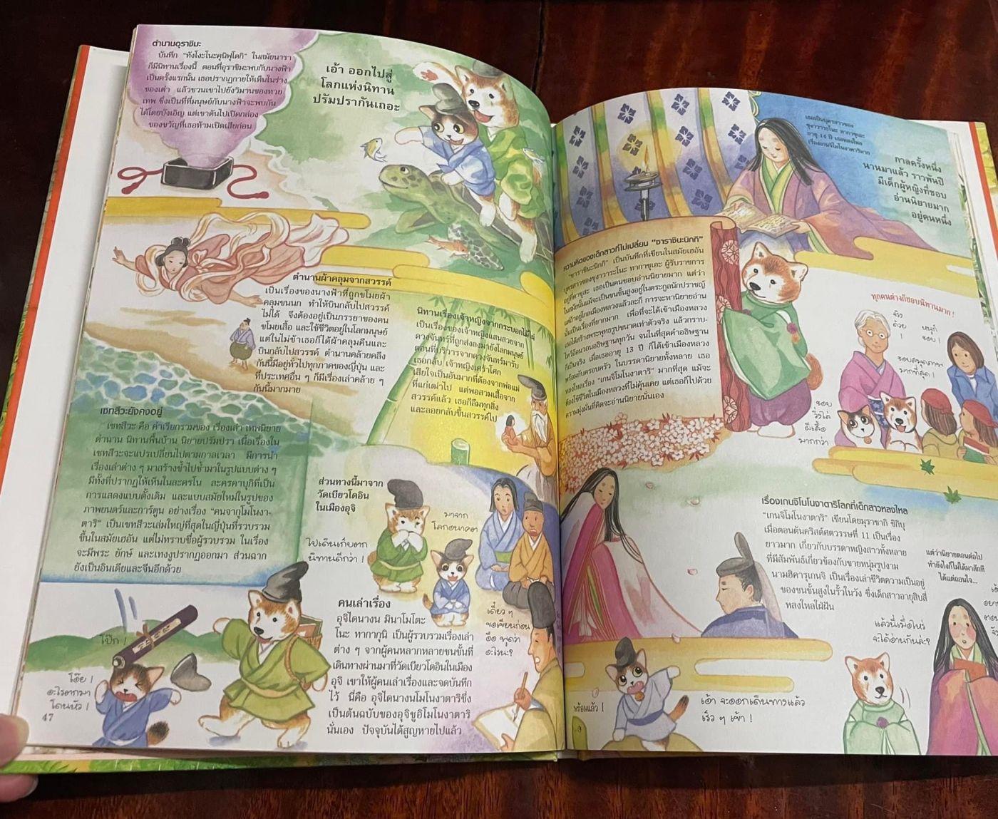 เจ้าหมาชิบาวังโกะและเจ้าเหมียวมิเกะพาไปรู้จักหญิงสูงศักดิ์ที่ชอบอ่านนิยายเป็นชีวิตจิตใจ โดยเฉพาะเรื่อง เก็นจิ (เราเคยรีวิวเรื่องราวนี้ให้ฟังในเรื่อง “Uji” ที่เป็นที่ท่องเที่ยว เพื่อนๆย้อนกลับไปดูกันได้ค่ะ) และมีนิทานมากมายของญี่ปุ่นที่น่าสนใจ ก่อนจะปิดท้ายพามาเที่ยวเกียวโต และทำให้เราเพิ่งรู้ว่า ที่วัดมีขนมพร้อมชาให้ดื่ม เพื่อให้คนที่มาถึงวัดได้พักผ่อนจากเดินทางไกลและเหนื่อย เพื่อจะได้ชมสวนและสงบใจ