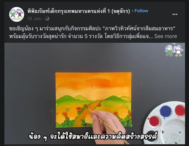 กิจกรรมแรกที่ฉันเจอคือ ”กิจกรรมศิลปะจากปลายนิ้ว” สำหรับเด็กอายุ 4-12 ปี โดยมีขั้นตอนดังนี้