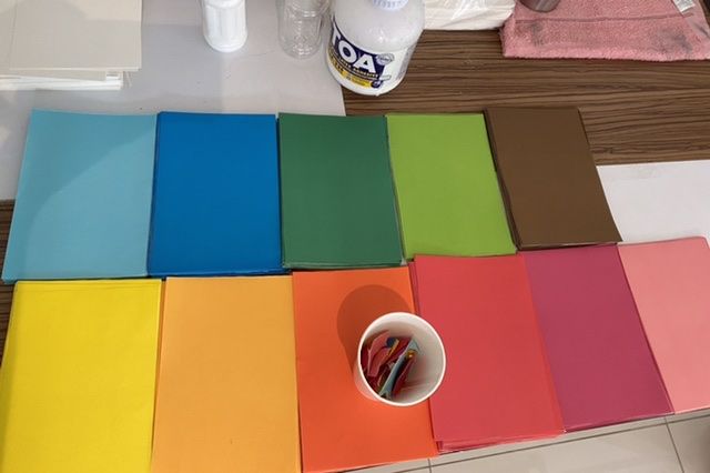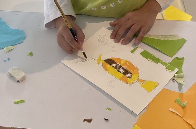 โดยเราจะเตรียมกระดาษขาวให้พร้อมดินสอสำหรับร่างภาพก่อนจะไปหยิบกระดาษสีมาฉีกและแปะลงบนกระดาษด้วยกาวแทนการระบายสี หากต้องการใช้กระดาษสีสีไหนน้อยก็สามารถแบ่งใช้กับเพื่อนที่มาร่วมกิจกรรมได้ ทำให้เด็ก ๆ รู้จักการแบ่งปัน
