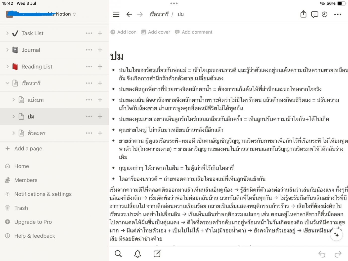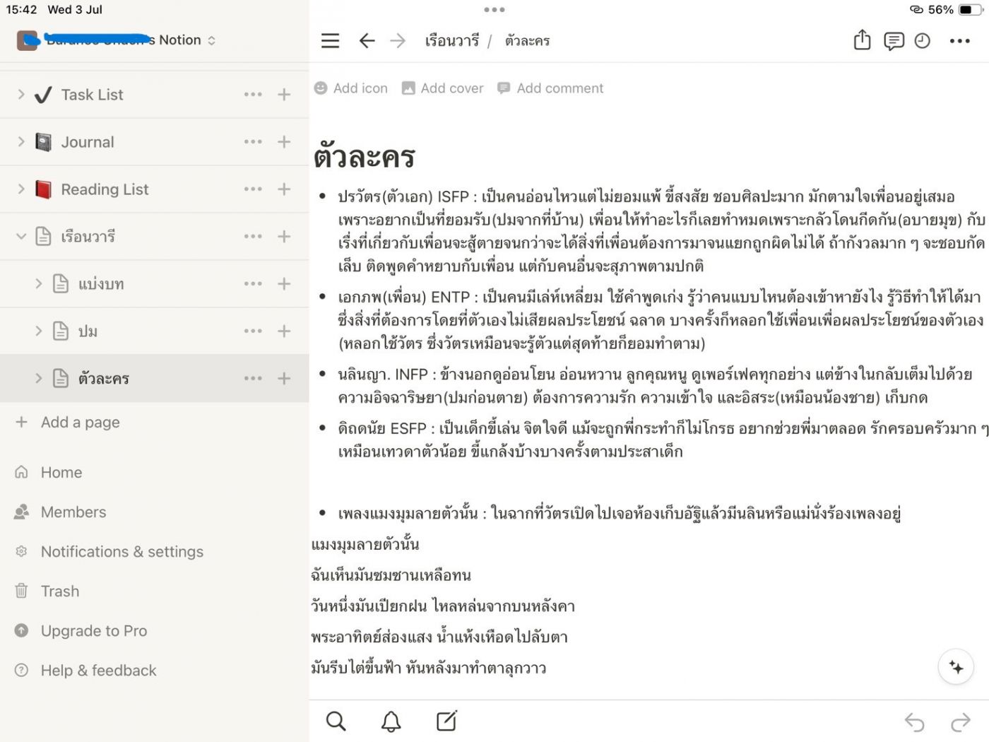 พวกโครงเรื่องกับฉากไม่อยากเท่าไหร่ อย่างโครงเรื่องก็มาจากภาพในหัวเป็นหลัก ส่วนฉากก็อาศัยทำ Mood board ในโปรแกรม Canva ให้เห็นภาพแล้วอธิบายเป็นภาษาเขียนเท่านั้น ทว่าตัวละครนี่แหละที่เป็นปัญหา เพราะเราต้องสร้างตัวละครที่มีบุคลิก นิสัยลักษณะแตกต่างกัน ไหนจะภูมิหลังของแต่ละตัวที่เสมือนเป็นพื้นฐานของสิ่งที่กล่าวไปข้างต้น จึงเลือกที่จะหยิบ MBTI หรือแบบทดสอบประเภทบุคลิกภาพตามทฤษฎีทางจิตวิทยาซึ่งเหล่าวัยรุ่นกำลังฮิตกันอยู่ โดยเราจะเปิดเฉลยของแต่ละไทป์แล้วนำมาใส่ในตัวละครแต่ละตัวว่าอยากให้มีบุคลิกภาพเป็นอย่างไรการแสดงออก ลักษณะนิสัย วิธีคิด แล้วเชื่อมโยงเข้ากับภูมิหลัง รวมไปถึงปมต่าง ๆ ในเรื่องก็จะรวบรวมทั้งหมดใส่ไว้ในแอปฯ Notion