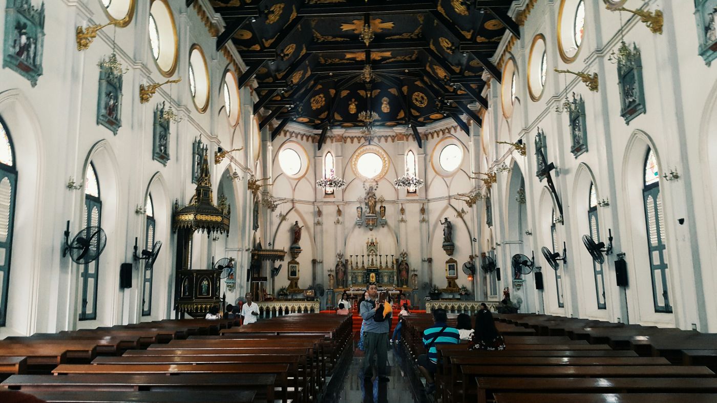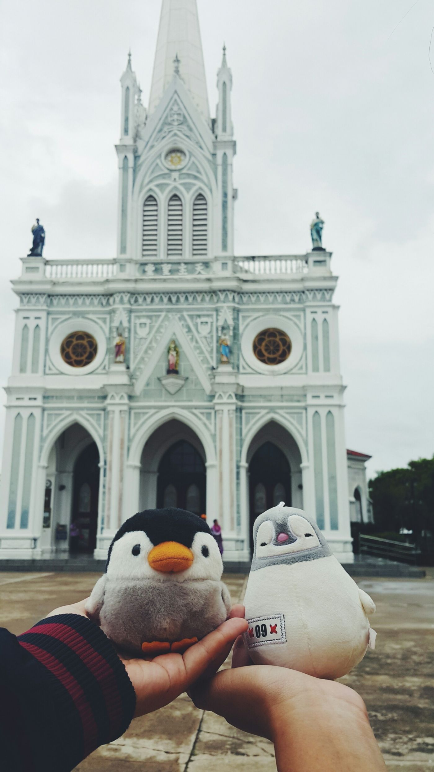 โอเคสาวๆ อิ่มท้องกันแล้ว เราก็ไปต่อกันที่ อาสนวิหารแม่พระบังเกิด หรือที่ชาวสมุทรสงครามเรียกว่าโบสถ์บางนกแขวก ตัวอาคารสีเทาขาวโดดเด่นเข้ากับบรรยากาศฝนปรอยแบบนี้มาก