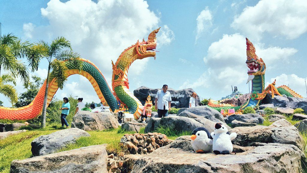 ขับรถกันมาไกลพอสมควรพวกเราก็มาถึงที่ อุทยานหลวงปู่สด วังพญานาคสี่ตระกูล ที่ตั้งอยู่ในอำเภอกบินทร์บุรี เราอึ้งตั้งแต่วิวทางเข้าที่ให้ความรู้สึกเหมือนอยู่ต่างประเทศเลย (ไม่นับแดดที่ร้อนจนแทบไหม้) พอเดินเข้ามาภายในอุทยานเราก็ต้องตะลึงกับประติมากรรมพญานาคทั้งสี่ตระกูลตามตำนาน สวยซะจนพูดไม่ออก