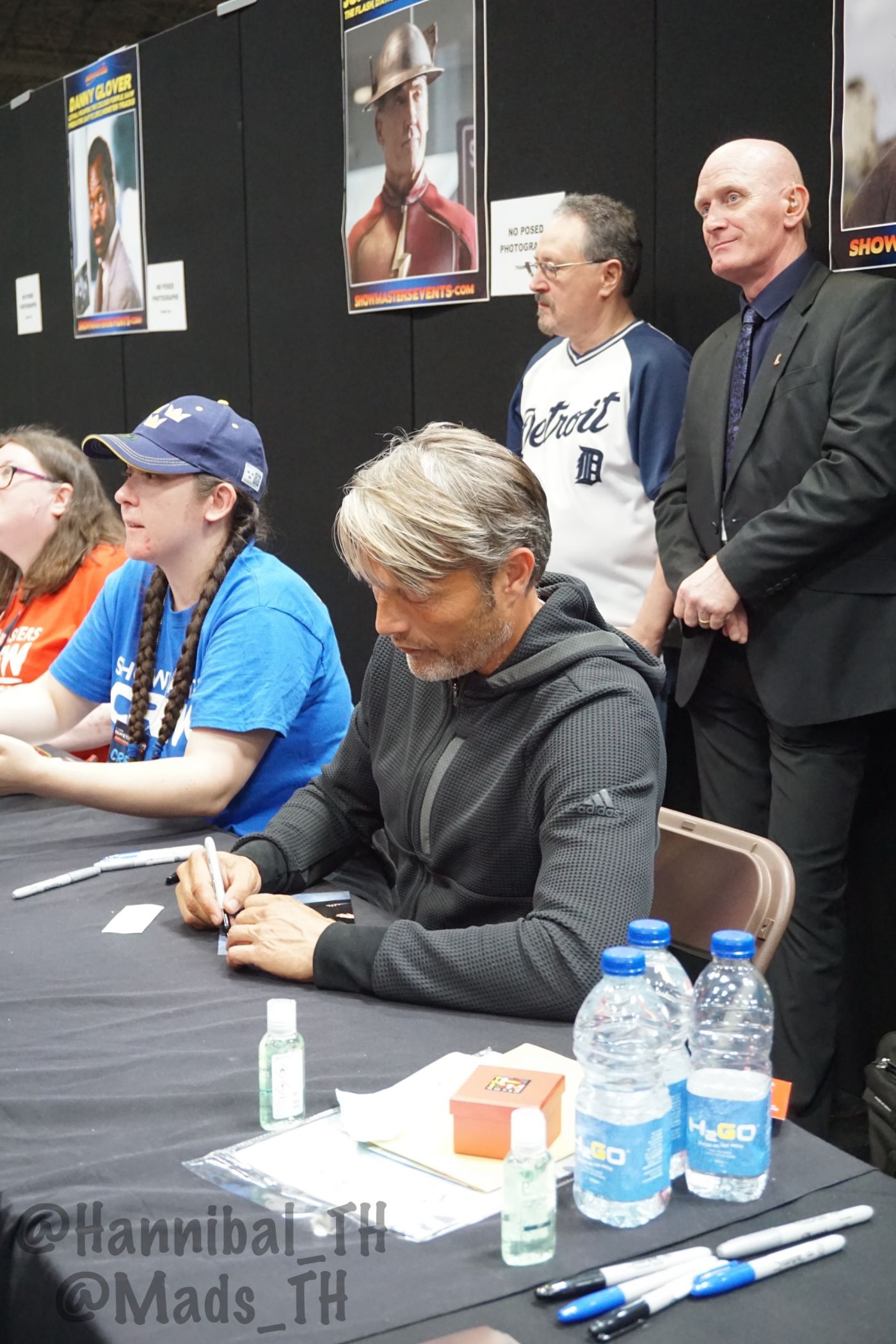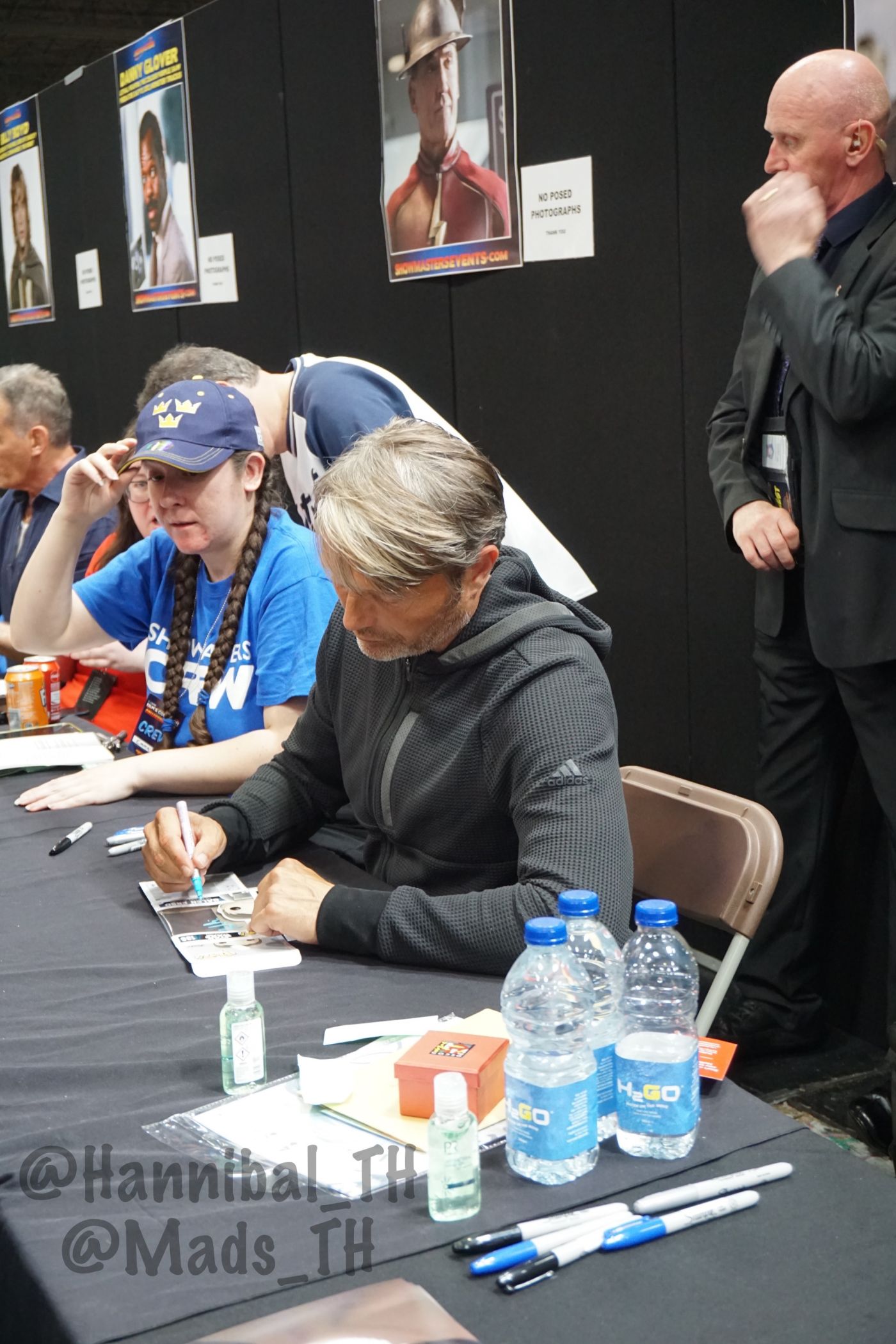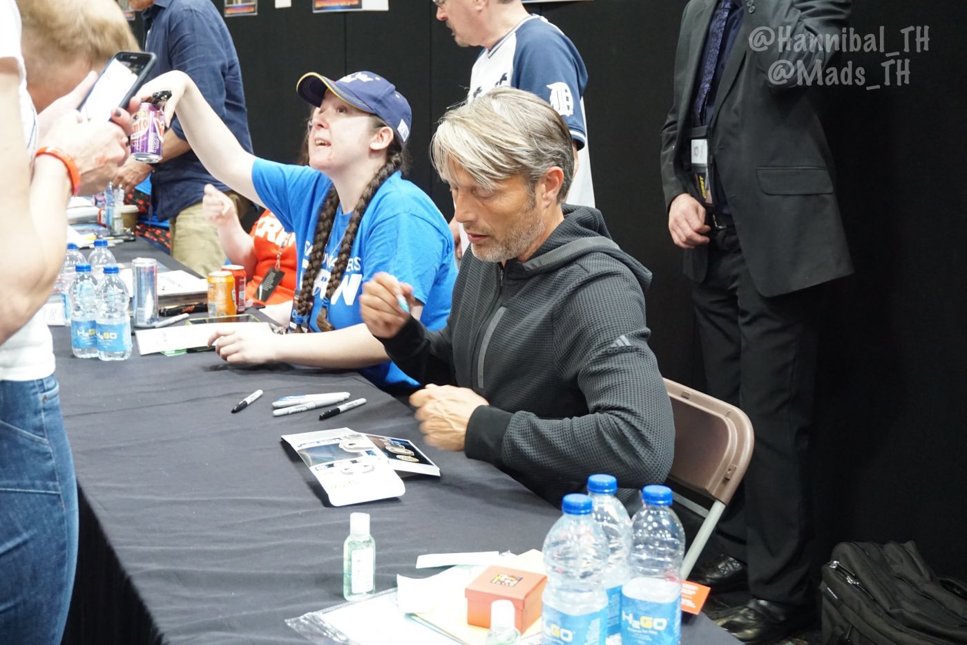 พอถึงคิวก็วางรูปให้ลุงเซ็น เนื่องจากใบแรกเป็นรูปของหนึ่งในแอดมินเพจ Mads Mikkelsen Thailand ที่เคยไปเจอลุงที่นิว ยอร์ก ลุงเห็นเลยถามว่านี่จากงานไหนเหรอ (ทำไมลุงจำไม่ได้ล่ะคะ 5555) เลยบอกว่าเป็นของเพื่อน จากงานที่นิว ยอร์กพอเซ็นเสร็จ ลุงก็หันไปเห็นว่ามีอีกกองรออยู่ ลุงเลยทักว่า "you've got a lot!" เลยบอกลุงว่าเพื่อนอยู่ไทยกันมาไม่ได้ เลยฝากมาจากนั้นเขาก็เซ็นให้เรื่อยๆ ค่ะ อ่านชื่อที่แนบไว้ด้วย (อ่านชัดเสียด้วยสิ)