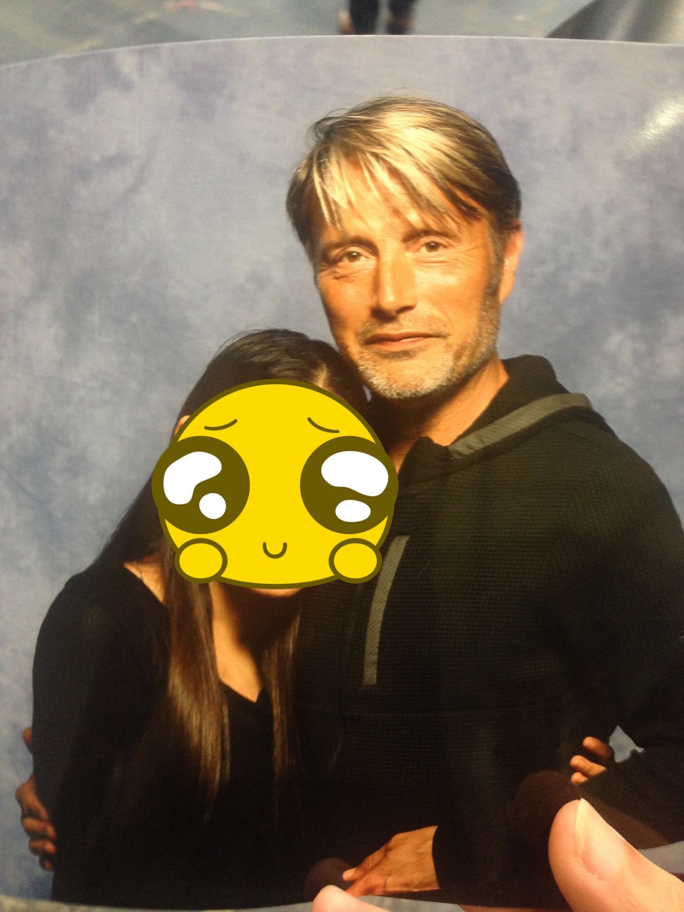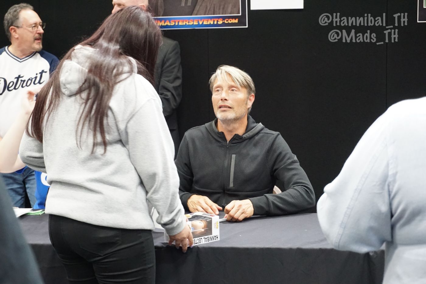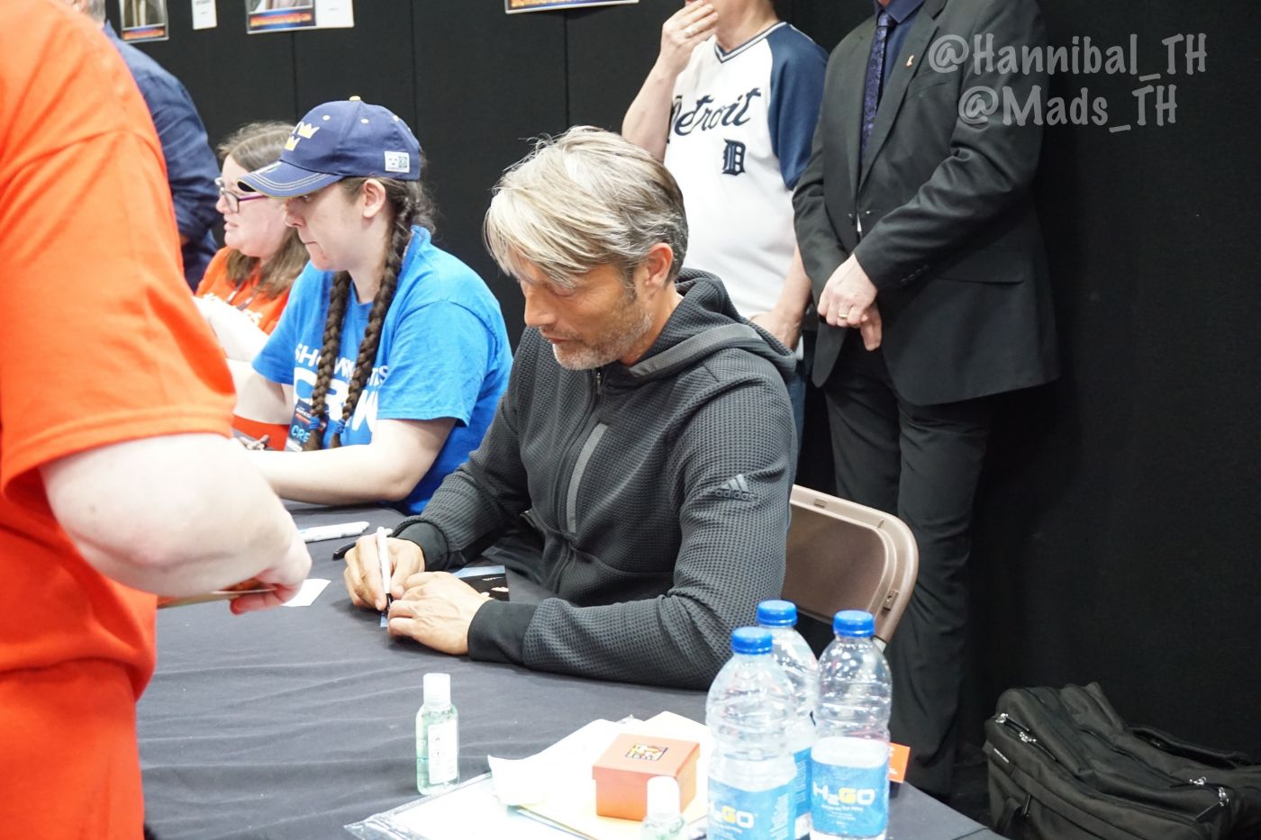 พอถึงคิวก็วางรูปให้ลุงเซ็น เนื่องจากใบแรกเป็นรูปของหนึ่งในแอดมินเพจ Mads Mikkelsen Thailand ที่เคยไปเจอลุงที่นิว ยอร์ก ลุงเห็นเลยถามว่านี่จากงานไหนเหรอ (ทำไมลุงจำไม่ได้ล่ะคะ 5555) เลยบอกว่าเป็นของเพื่อน จากงานที่นิว ยอร์กพอเซ็นเสร็จ ลุงก็หันไปเห็นว่ามีอีกกองรออยู่ ลุงเลยทักว่า "you've got a lot!" เลยบอกลุงว่าเพื่อนอยู่ไทยกันมาไม่ได้ เลยฝากมาจากนั้นเขาก็เซ็นให้เรื่อยๆ ค่ะ อ่านชื่อที่แนบไว้ด้วย (อ่านชัดเสียด้วยสิ)