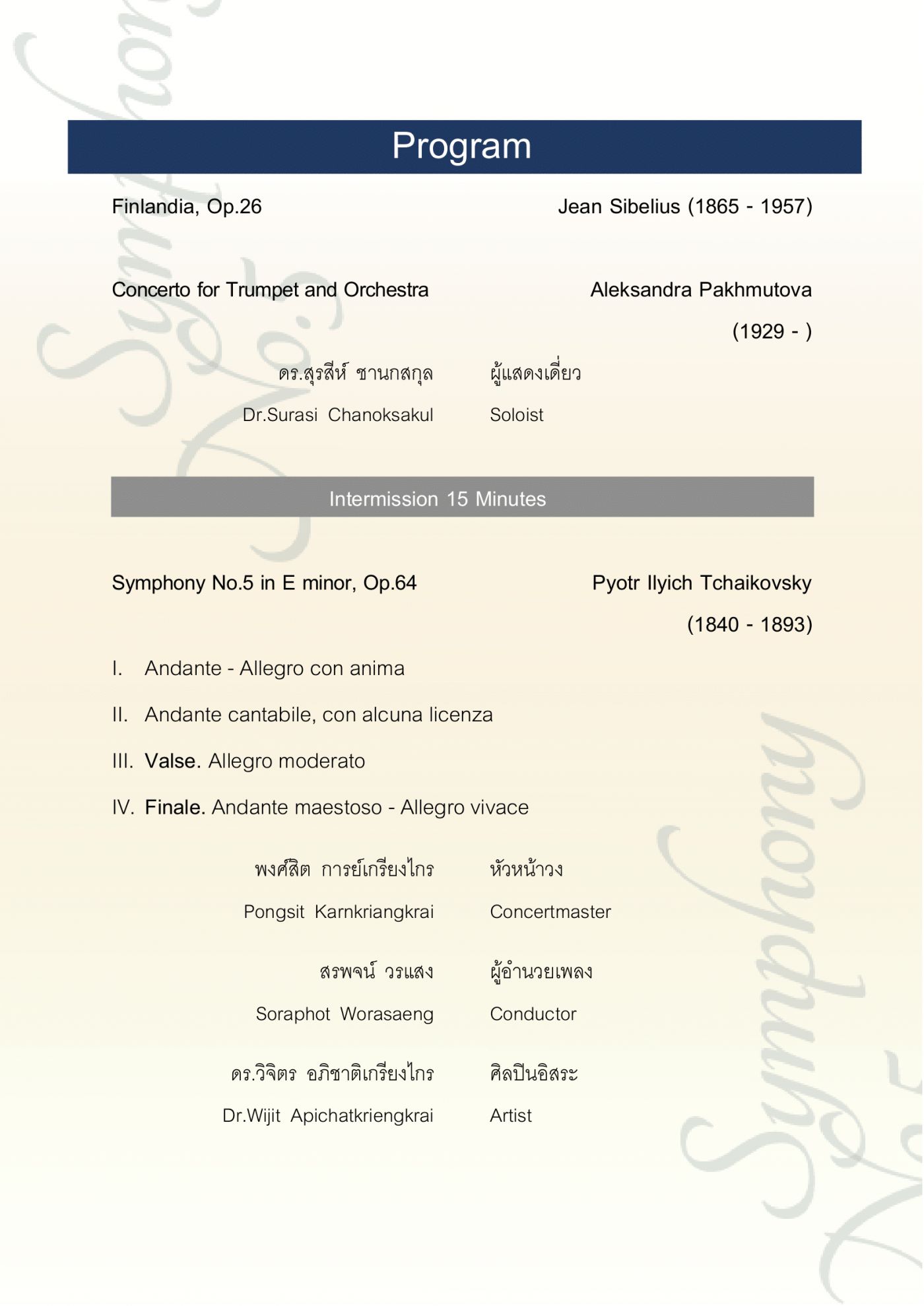 “Tchaikovski V Concert” จัดแสดงโดย : กลุ่มงานดุริยางค์ซิมโฟนี กองการสังคีต สำนักวัฒนธรรม กีฬา และการท่องเที่ยว ร่วมกับ ภาควิชาดนตรี คณะมนุษยศาสตร์ มหาวิทยาลัยเกษตรศาสตร์ และกลุ่มนิเวศสุนทรีย์