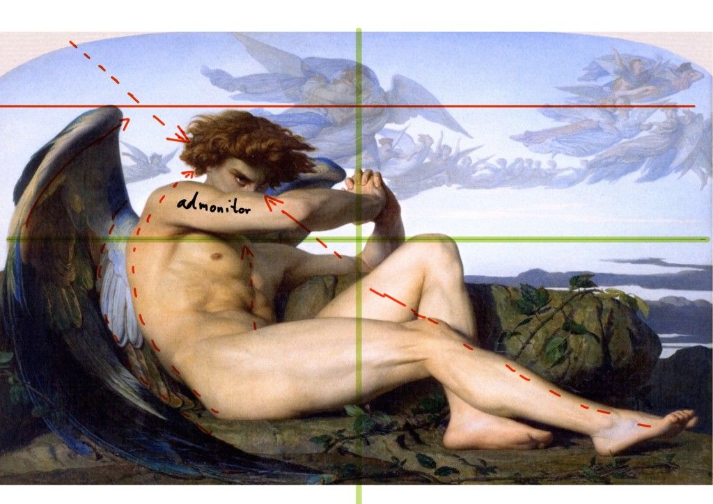 เทวทูตที่วางท่าคือพระเอกของเรื่อง ดังนั้นเราลองมาลากเส้นนำสายตาที่ศิลปินพยายามแสดงในมุมแทยงตามความจงใจวางท่าเทวทูตของศิลปิน จะเห็นว่าท่อนขาขาวนวลนำเราสู่ท่นแขนศอกและดวงตา เช่นเดียวกับเส้นโค้งของวงปีก (ดูเส้นสีแดง) แม่กระทั่งมัดกล้ามในเส้นตั้งนำเราเข้าไปสู่สายตาของเทวทูต สายตาเป็นเครื่องหมายของภาพเขียนอย่างหนึ่งที่เรียกว่า admonitor เป็นจุดเชื่อมระหว่างเหตุการณ์ในภาพเเละผู้ชม ในภาพที่มีตัวละครหลายตัวดำเนินเรื่อง มักจะมีตัวละครตัวหนึ่งส่งสายตามาหาผู้ชมเสมอ แต่ภาพนี้มีตัวละคร “เด่นมาก” ตัวเดียวมันเป็นผู้เชื่อมในตัวมันเอง การที่ศิลปินนำสายตาผู้ชมมาสู่ดวงตาคือการเน้นย้ำว่า “ดูที่ตาชั้นสิ” นี่คือหัวใจของภาพ