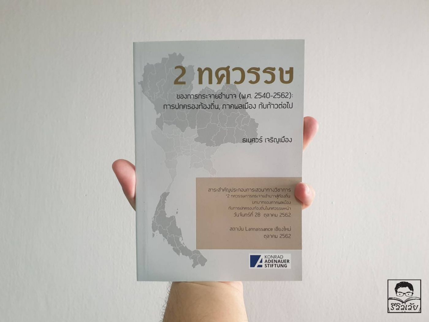 "2 ทศวรรษของการกระจายอำนาจ (2540-2562): การปกครองท้องถิ่น ภาคพลเมือง กับก้าวต่อไป" ไม่รู้ว่าจะเรียกหนังสือเล่มเล็ก ๆ เล่มนี้ว่าหนังสือได้หรือเปล่า เพราะถ้านับดูดี ๆ มันมีลักษณะของการเป็น "เอกสารประกอบการสัมมนา" และ "เอกสารสรุปกิจกรรมการเสวนา" เสียมากกว่า แต่ก็ซื้อมันมาจาก "ร้านหนังสือ" (แต่จำราคาไม่ได้) งั้นเราจะขอเรียกมันว่า "หนังสือ" ก็แล้วกัน