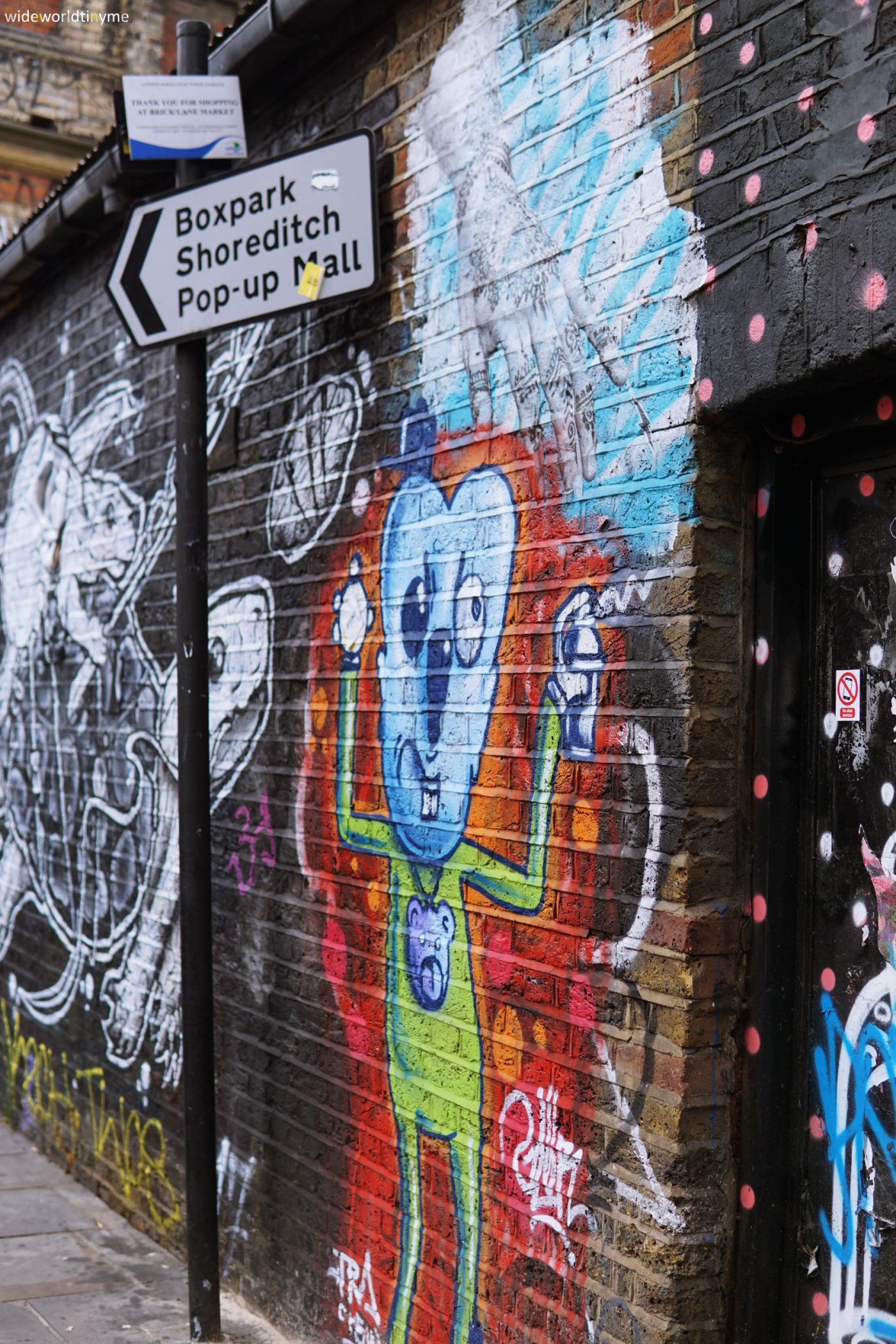 วันนี้ลอนดอนก็ไม่ทำให้ต้องเสียชื่อ นั่นคือเมฆฝนนำน้ำปรอยๆ ตกให้ชื่นใจ แล้วก็ตกบ้าง ไม่ตกบ้างไปตลอดวัน (ตามสบายค่ะ) ฉันนัดเจอกับแหนดแถว Shoreditch ซึ่งตามที่หาข้อมูลมาคือมี Street Art และ Graffiti ให้ได้ดูอยู่หลายที่ แล้วก็ไม่ทำให้ผิดหวังนะ คือไม่ได้หาตำแหน่งอะไรเป็นพิเศษ คือเดินจาก Shoreditch มุ่งหน้าไป Columbia road flower market ก็ผ่านอยู่หลายภาพให้ได้ถ่ายรูปคู่