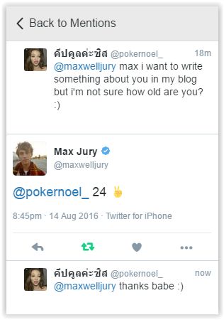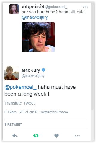 ใครฟังแล้วชอบ โดนใจ อยากหาเพื่อนพูดคุย ถ้าไม่ทวิตมาคุยกับเราในแอค @odditynoel_ ก็สามารถทวิตไปหานางได้โดยตรงที่แอค @maxwelljury ได้เลยนะคะ นางมักจะตอบ เป็นกันเองมาก 5555