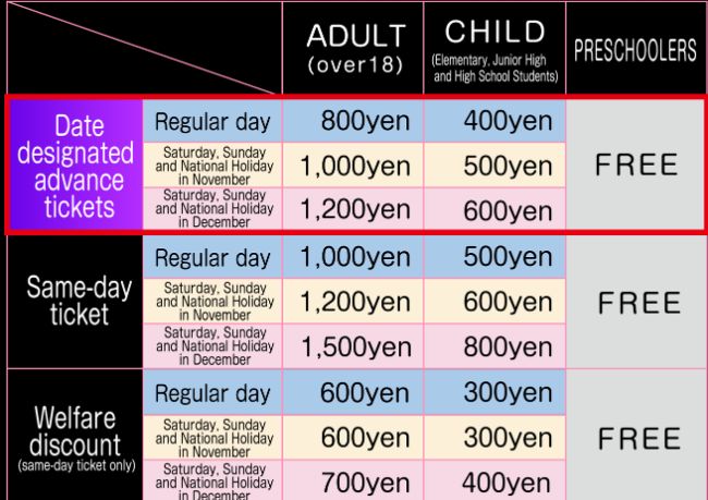 วันหยุดเสาร์-อาทิตย์และวันหยุดนักขัตฤกษ์ในเดือนพฤศจิกายน : 1000เยน (ผู้ใหญ่อายุ18ปีขึ้นไป) และ 500 เยน (สำหรับเด็กประถมและมัธยมต้น/ปลาย)
