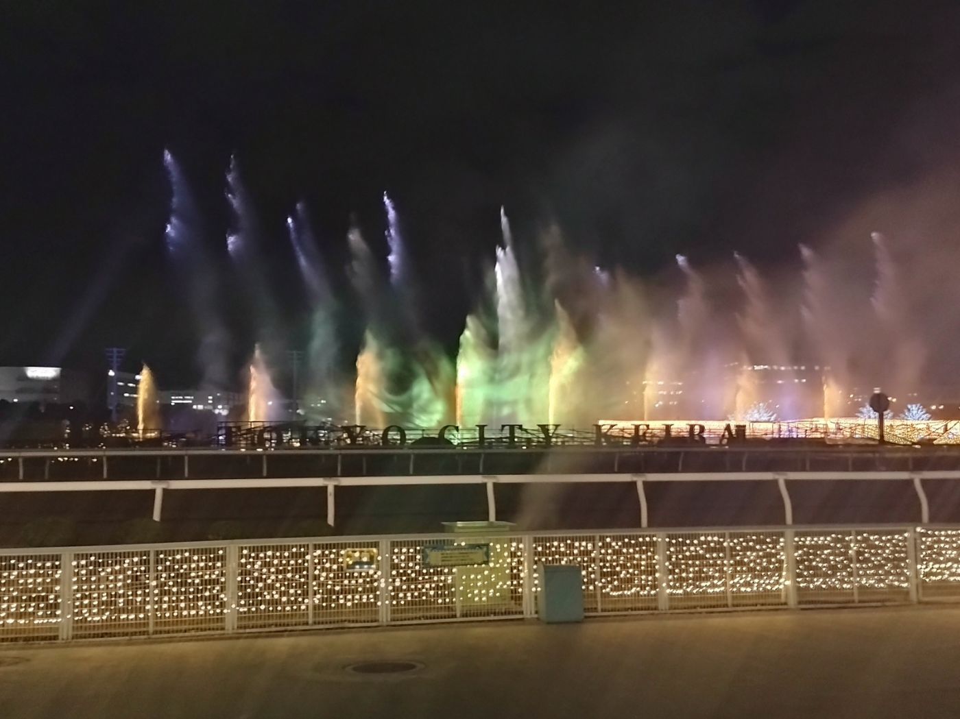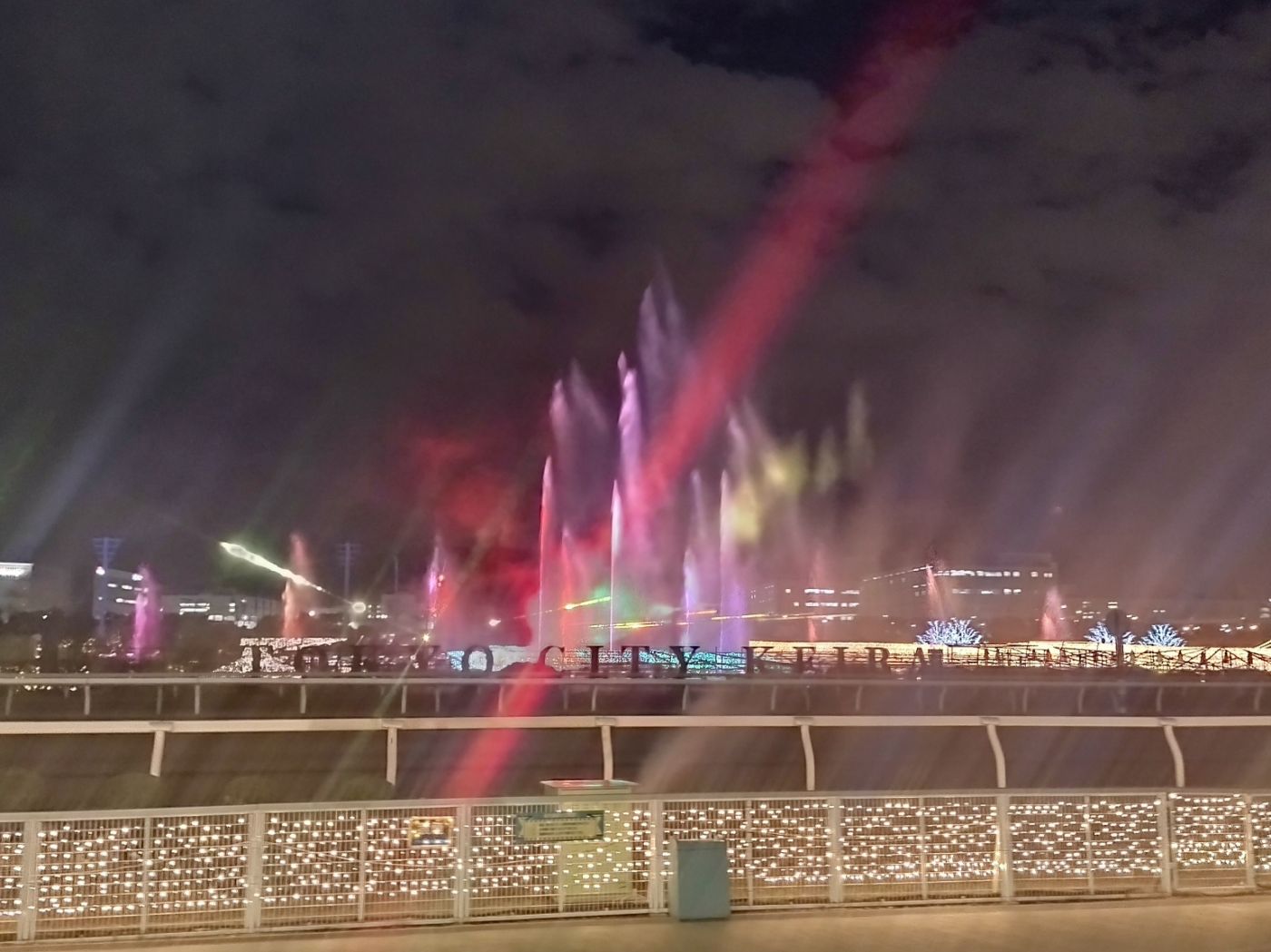 ตอนที่ชิจิมาถึงลานน้ำพุ ยังไม่ถึงเวลาแสดง เลยนั่งรอตรงที่นั่งชมก่อนค่ะ ขอบ่นหน่อยว่าหนาวมากกกกกกกก ใครที่จะมาชมน้ำพุไฟประดับช่วงหัวค่ำ อย่าลืมสวมเสื้อหนา ๆ หยิบถุงมือและผ้าพันคอมาด้วยก็ดีนะคะ ชิจิใส่เสื้อขนเป็ด ยังหนาวอยู่เลยค่ะ ?