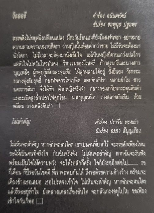 และฟอนต์เครดิตคนทำงานคือ LC Manop ฟอนต์พาดหัวตัวแคบในตำนาน (ซึ่งได้รับการคืนชีพโดยค่ายคัดสรร ดีมาก ในนามของ Manop Variable ที่ให้สตรีมได้ใน Adobe Fonts) ส่วนตัวเนื้อความในเนื้อเพลงใช้ DB Pradit ซึ่งเข้ากับอัลบั้มร็อกนี้จริง ๆ