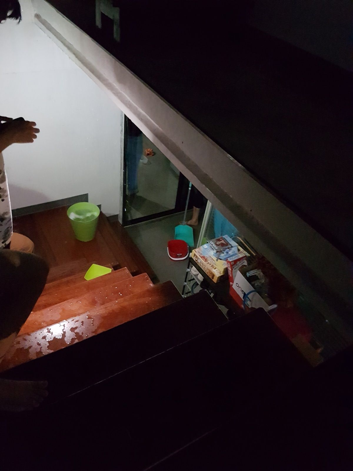 ด้วยเหตุนี้บริษัทจึงต้องตัดไฟเพื่อความปลอดภัยของทุกชีวิต พวกเราตกอยู่ในความมืืด เด็กฝึกงานชั้นหนึ่งต้องอพยพขึ้นชั้นบน ขณะที่พี่ ๆ ลงไปวิดน้ำกันชั้นล่าง ส่วนเราเป็นทีมเก็บของหนีน้ำที่ชั้นสอง น้ำท่วมแค่ครึ่งความหนาของฝ่าเท้าเราแต่ก็สร้างความเสียหายไม่น้อย กล่องเอกสารต่าง ๆ ที่วางบนพื้นเปียกหมด พอเก็บของเสร็จเราก็ช่วยกวาดน้ำลงชั้นหนึ่ง ซึ่งไปโดนพี่ ๆ ที่วิดน้ำอยู่ข้างล่างจนพี่ตะโกนขึ้นมาว่า