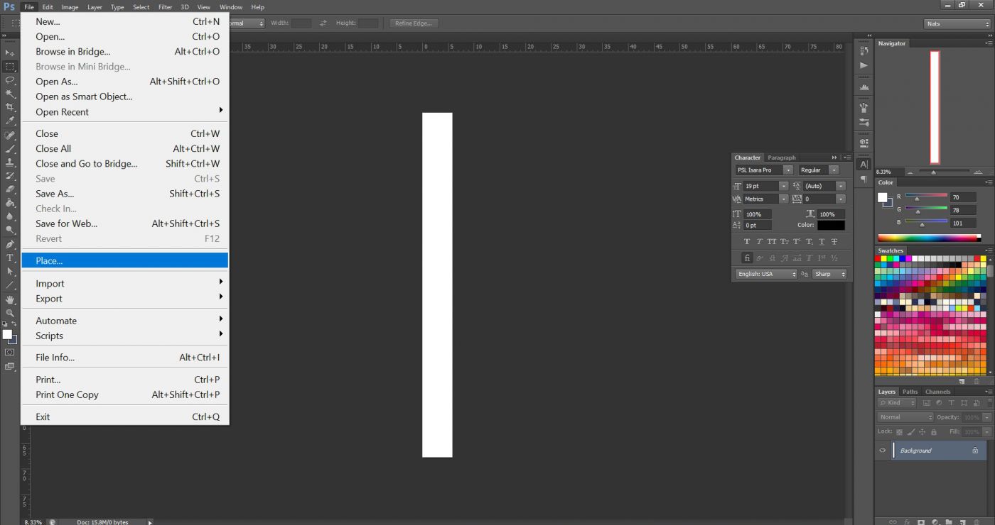 แต่วิธีที่เราใช้เรียกได้ว่าเป็นวิธีที่มักง่ายและขี้เกียจ ความจริงคือเราเพิ่งเคยรวมหน้ายาวเป็นครั้งแรกและทำงานไม่เสร็จสักทีเลยหันไปปรึกษาคู่หู และเพื่อนก็แนะนำวิธี Place มา ซึ่งวิธีนี้ง่ายจริง เพียงไปที่ File > Place เลือกไฟล์ที่จะวางแล้วกดตกลง ไฟล์นั้นก็จะมาอยู่ในหน้ายาวโดยมีขนาดพอดีเป๊ะ ทำให้เราไม่ต้องย่อให้เสียเวลา แต่.. โฟลเดอร์ที่แบ่งไว้ทั้งหมดจะถูกรวมเป็นภาพเดียว