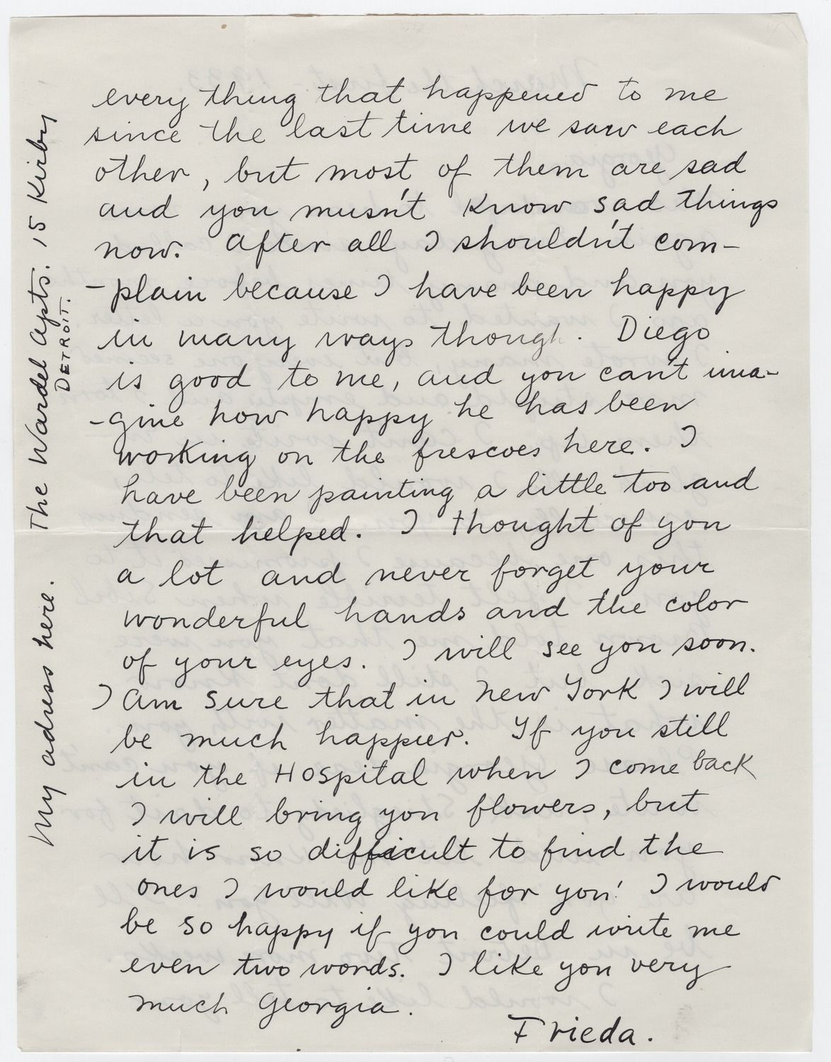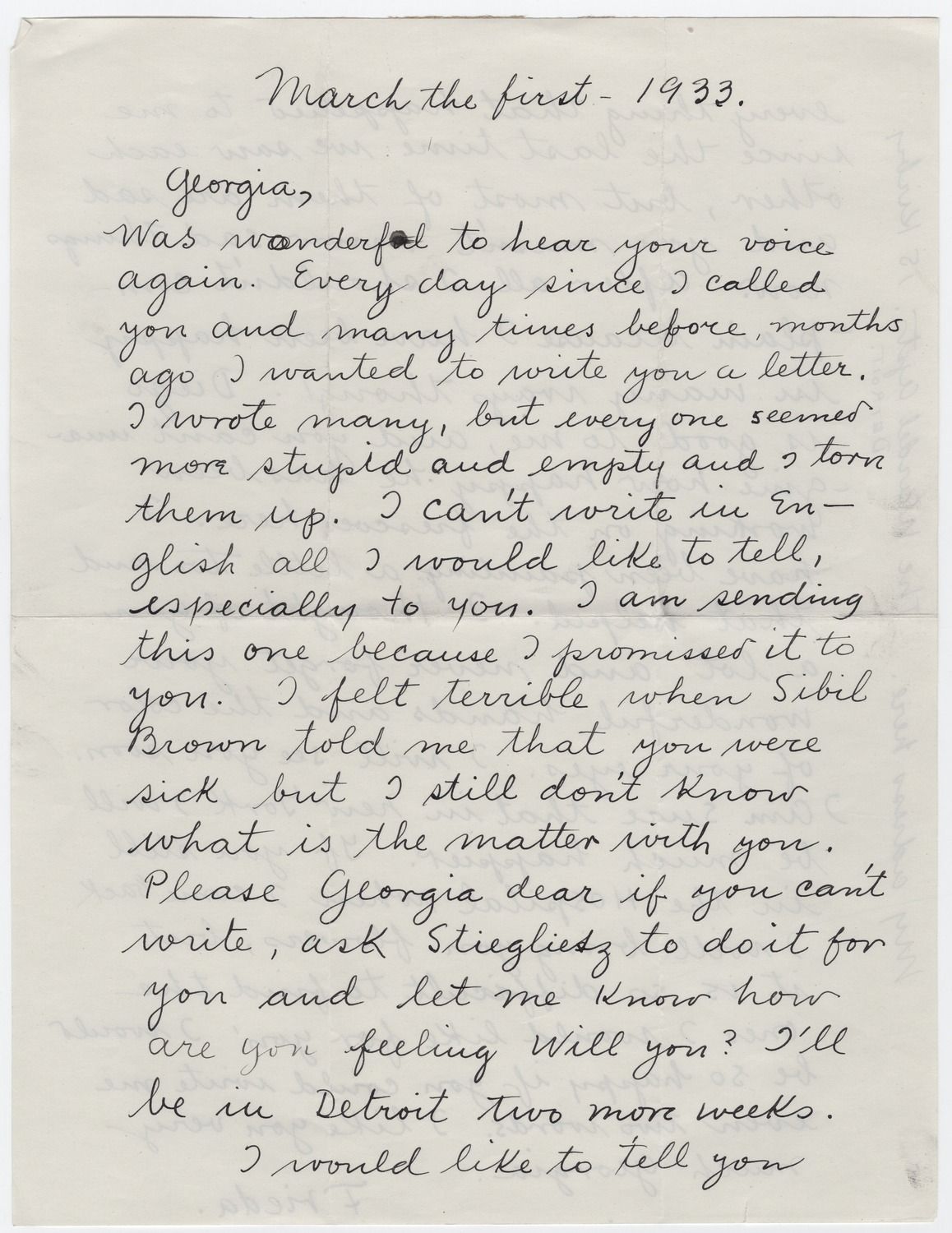"O'Keeffe was in the hospital for three months, she went to Bermuda for a rest. She didn’t made [sic] love to me that time, I think on account of her weakness. Too bad. Well that’s all I can tell you until now."