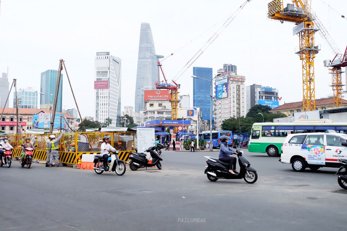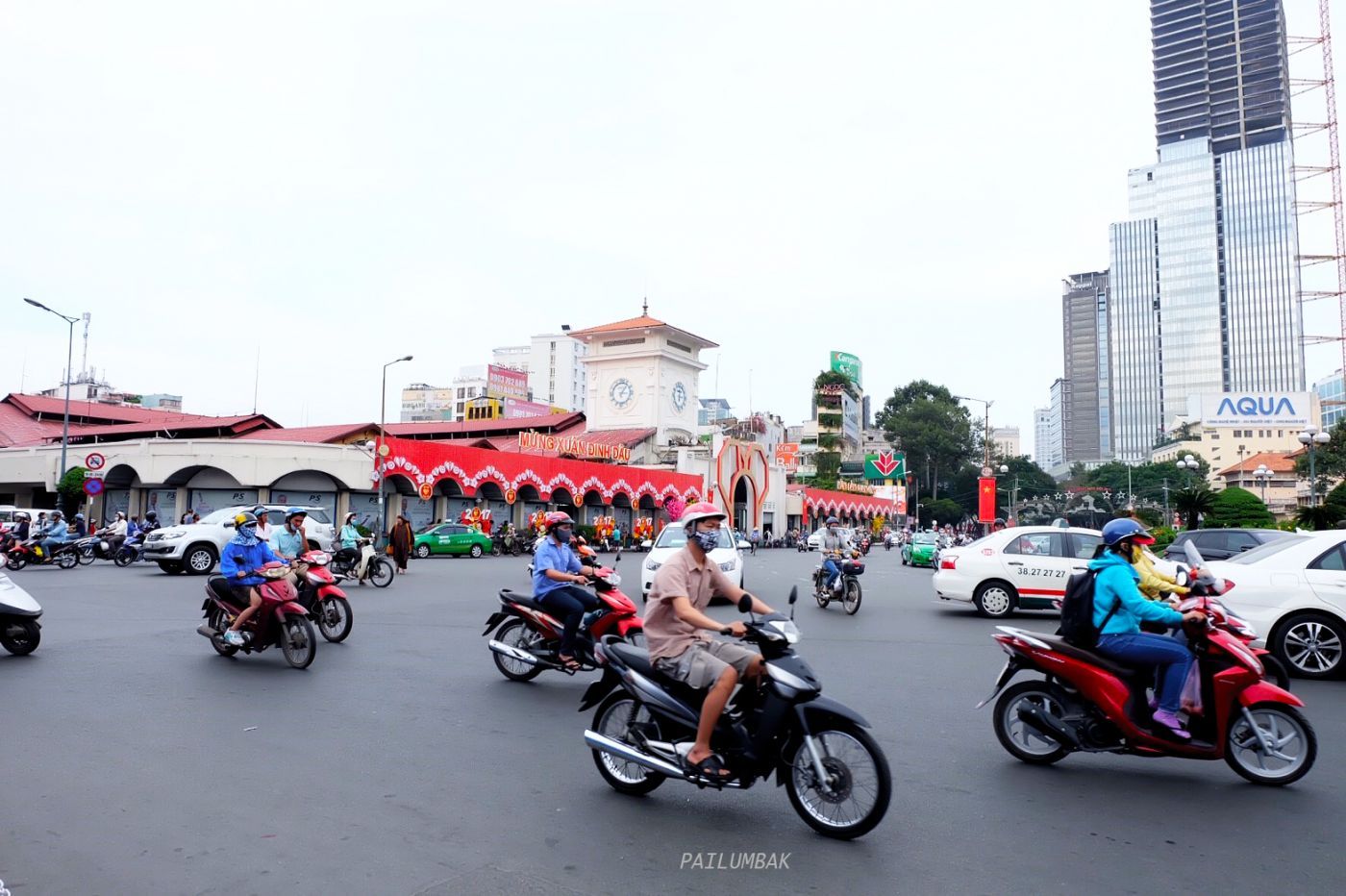 รถเมล์วิ่งเข้าเมืองอย่างต่อเนื่องไม่มีจอดนิ่ง เร็วบ้าง ช้าบ้างตามสภาพการจราจรบนถนน แต่รถไม่ติดเลย ผ่านตลอดพร้อมกับเสียงปี๊น ปี๊นน ปี๊นนน ดังอย่างต่อเนื่องอย่างกับเล่นเพลงออเครสตร้า จนทำให้เราคิดในใจว่าถ้ากูลงไปจะไม่โดนชนใช่มั้ย...ขออยู่บนรถเมล์ทั้งวันได้มั้ย กลัววเหลือเกิน นี่พูดจากใจ ระหว่างที่นั่งอยู่บนรถเมล์เราก็พยายามมองว่าถึงไหนแล้ว กลัวเลยป้ายมาก แต่ไม่ต้องเป็นห่วงเพราะคนขับรถจะบอกเองว่าถึงตลาดบินถั่น (Ben Thanh Market) แล้ว โล่ง...มั้ยไม่รู้ แต่หลงแน่นอนบอกเลยยยย