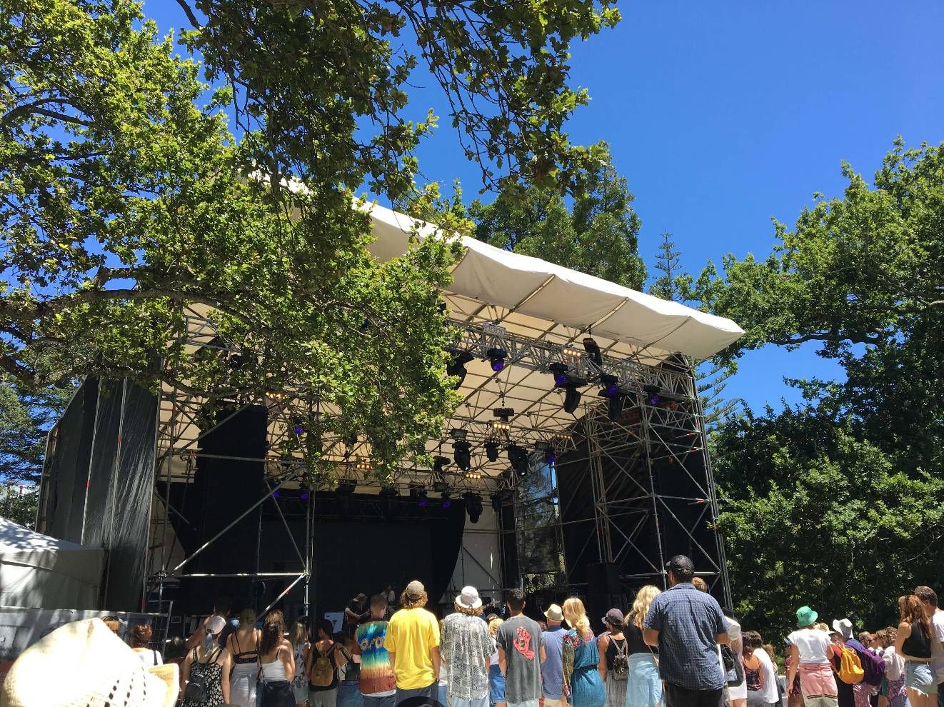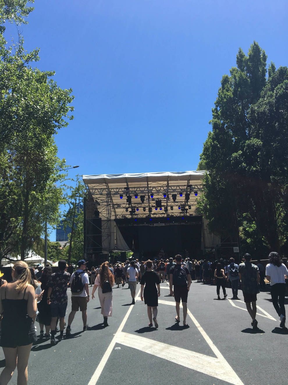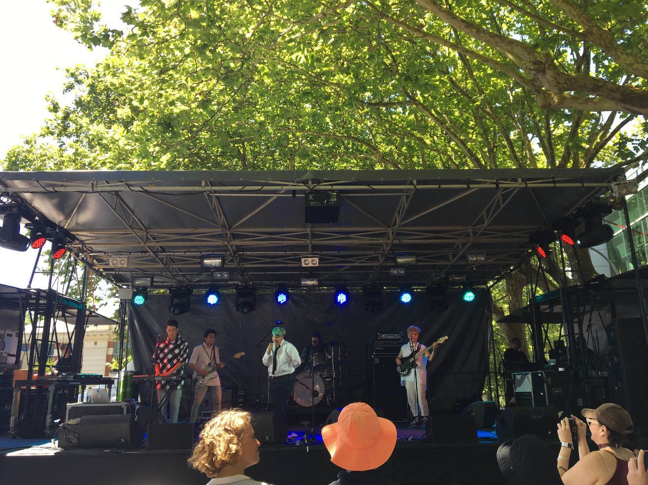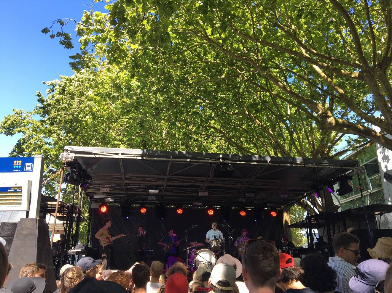 Thunderdome เป็นเวทีที่เล็กสุด แต่เราชอบสุด เพราะร่ม5555 มีต้นไม้ล้อมสองข้างทาง ตั้งอยู่ข้างห้องสมุดกลางของมหาลัยที่เรากำลังจะเริ่มเรียนเดือนมีนานี้ บรรยากาศสบายๆ เหมาะกับวงชิวๆคิ้วท์ๆ ความฮาคือข้างเวทีเป็นป้ายรถเมล์ที่ตารางโชว์ว่าวิ่งปกติทั้งที่ถนนปิด (รถเมล์ประเทศนี้ชอบหลอก) แถมยังใช้วายฟายมหาลัยอัพไอจีสตอรี่ไปดูโชว์ไปได้อีก เราว่าวงนี้น่าสงสารมาก เพราะเล่นเป็นวงแรกตั้งแต่เกตเปิด คนน้อยแบบเหงาแทน แต่วงก็พยายามเล่นเต็มที่ มีพ่อแม่นักดนตรีมาเชียร์ด้วย คนดูที่เหลือก็น่ารักพยายามให้กำลังใจส่งเสียงเชียร์ตลอด เล่นจนเพลงหมดแล้วคนก็ยังน้อยแถมเวลาเหลืออีก มีคนดูตะโกนบอกให้เล่นอีก วงเลยเล่นเพลงแรกของโชว์ เพราะคนเกินครึ่งไม่ได้ฟังตั้งแต่เริ่ม เราพยายามจะโยกตัวตามแต่คนน้อยเหลือเกิน เขิน ปกติไม่ใช่คนชอบเต้น ผับบาร์ก็ไม่ค่อยเข้า ไปแต่คอนเสิร์ตนี่แหละ