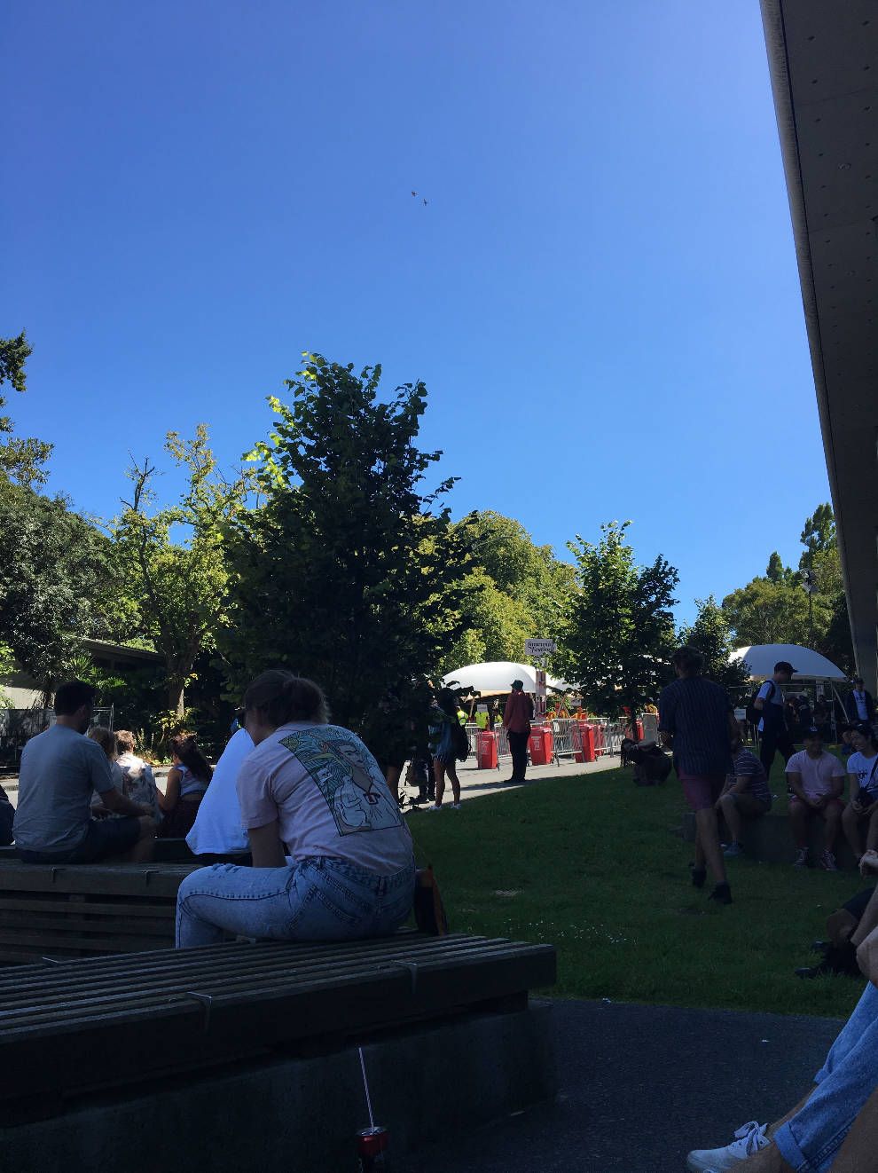 ประตูเปิด 11.30 เรามารอหน้าประตูก่อน 15 นาที นั่งมองแฟชั่นคนมาดูคอนเสิร์ตไปพลางสงสัยว่าคนพวกนี้มันไปอยู่ไหนมาตลอดสองเดือนที่เราอยู่ที่นี่ เพราะ 90% เป็นฝรั่งมีตั้งแต่เด็กไฮสคูลยันคนแก่หัวขาว แต่ส่วนใหญ่ก็เด็กมหาลัยแหละ มีเอเชียนอยู่จึ๋งนึง แอฟริกันกับละตินอเมริกายิ่งน้อยเข้าไปใหญ่ ที่ผ่านมาเจอแต่คนจีนเต็มเมืองจนลืมไปว่าประเทศนี้ก็มีคนขาว คนในงานก็ไม่ได้น้อยหรอกแต่เดินชนกันทั้งวันจนจำกันได้หลายคนเลย