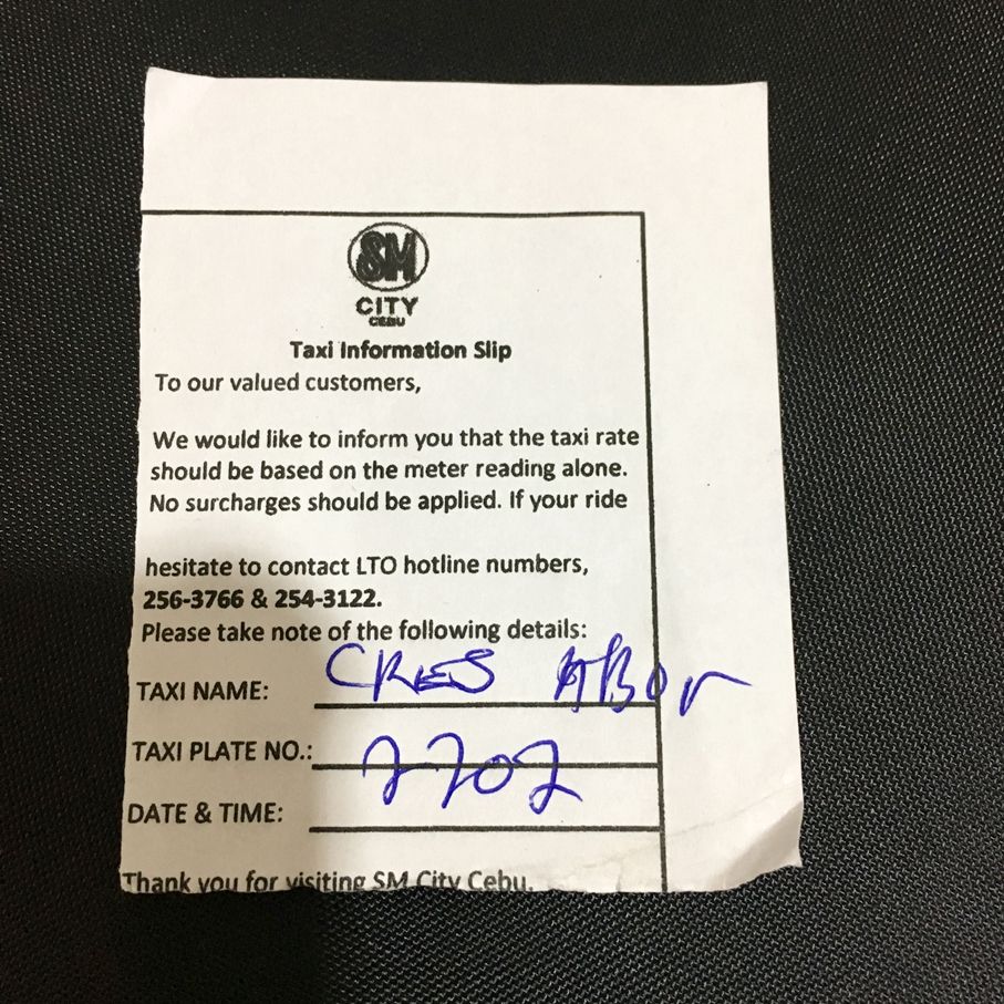 หน้า SM City จะมีจุดเข้าคิวเรียกแท็กซี่ ก็ไปยืนต่อคิวนะ จะมีพนง.จดเลขรถให้เรานะ ระหว่างยืนรอ บางทีจะมีคนมาถามนู่นนี่ มาจากไหน จะไปไหน ไปส่งมั๊ย แล้วชี้ไปที่แท็กซี่เหลือง แท็กซี่เหลือง คือแท็กซี่สนามบิน แพงมาก เริ่มต้น 80 เปโซนี่ท่องมาว่าขึ้นแต่ แท็กซี่ขาว คือ แท็กซี่ทั่วไป ให้กดมิเตอร์ทุกครั้ง เริ่มต้น 40 เปโซ นั่งมาถึงหอประมาณ 60-70 เปโซ ยังไม่ถึงราคาเริ่มต้นมิเตอร์เหลืองเลย