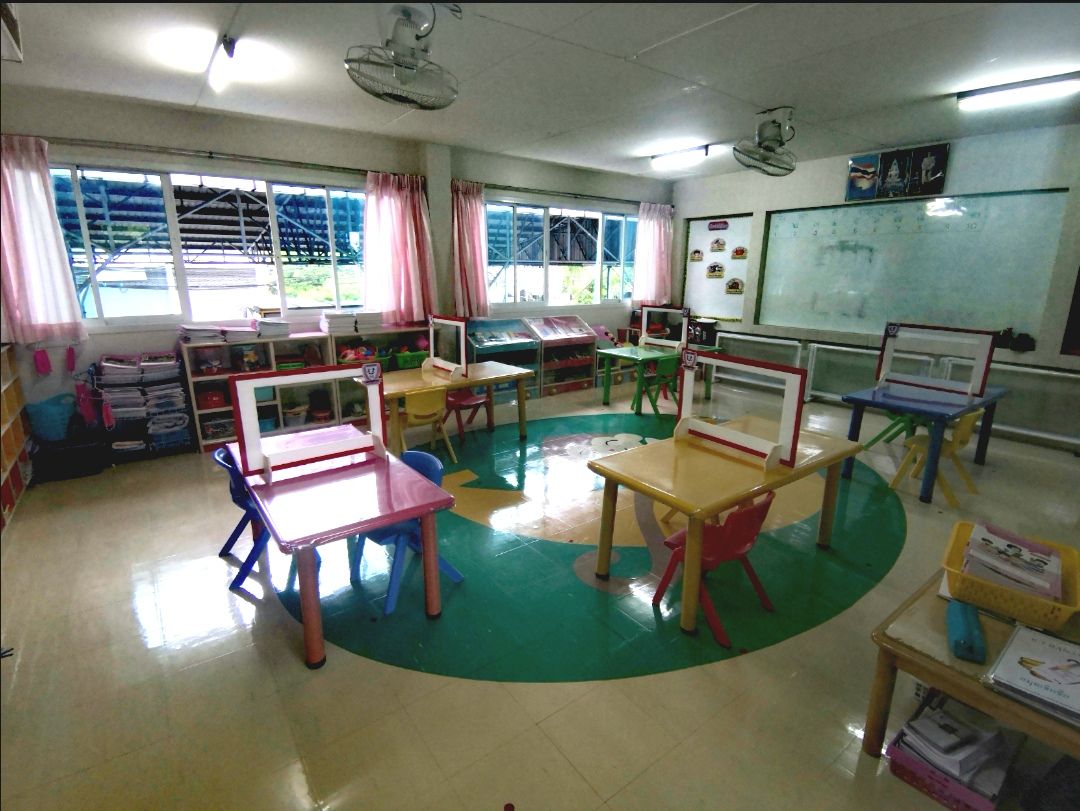 เป็นห้องเรียนที่มีพื้นห้องเป็นรูปลิงนั่งบนกล้วยขนาดใหญ่พร้อมถือกล้วยปลอกเปลือกในมือหนี่งผลแสนน่ารัก โต๊ะเก้าอี้มีสีสันสดใสฟ้า เขียว ชมพู เหลือง บนโต๊ะมีแผงใสกั้นป้องกันโควิด เก้าอี้จัดให้เด็ก ๆ นั่งห่างกันรวมทั้งห้องนั่งได้ประมาณ10กว่าคน